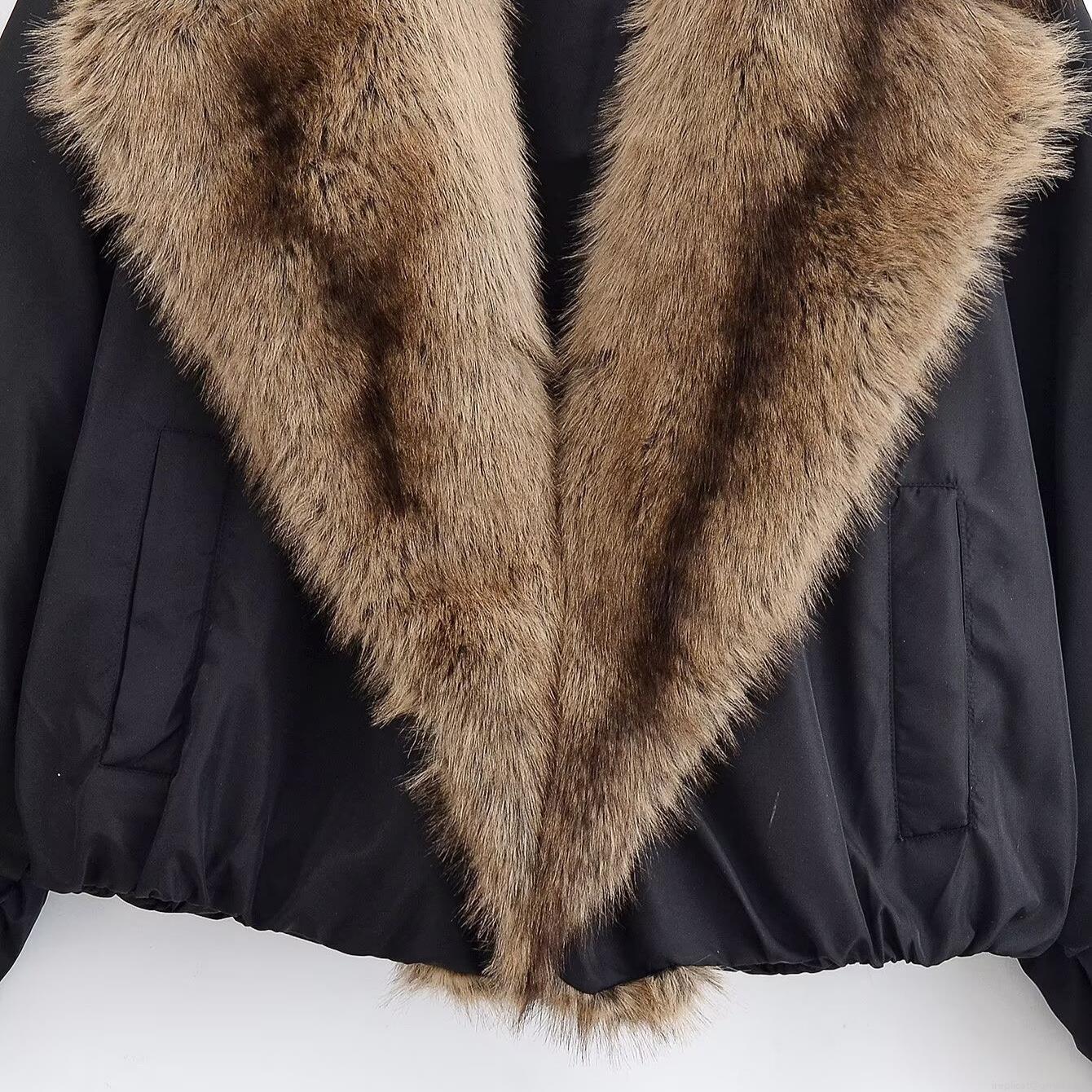 • Women's Winter Fashion Casual Loose Bomber Jacket With Large Faux Fur Collar Thickened Solid Black Warm Short Outerwear For Ladies Outdoor Daily Wear