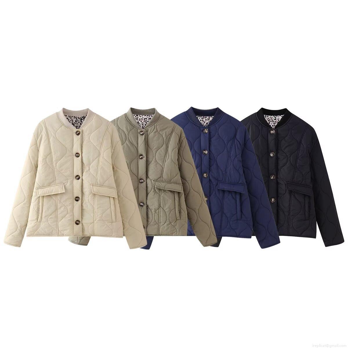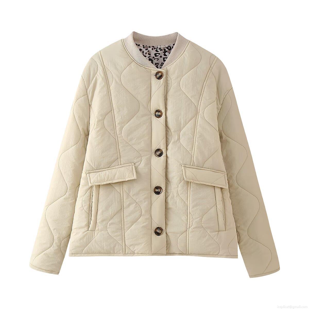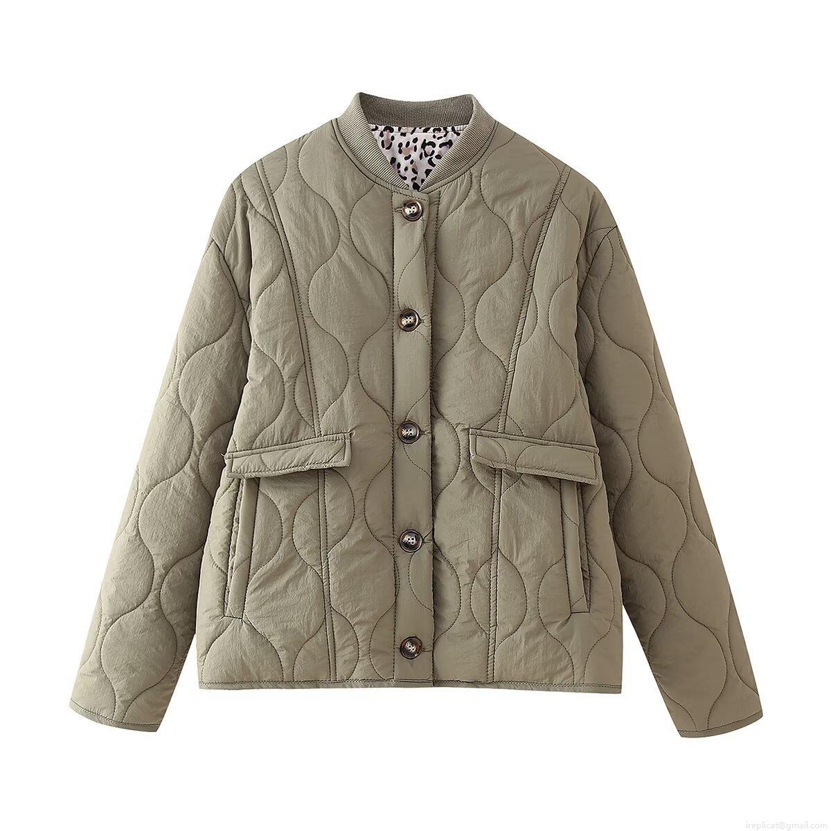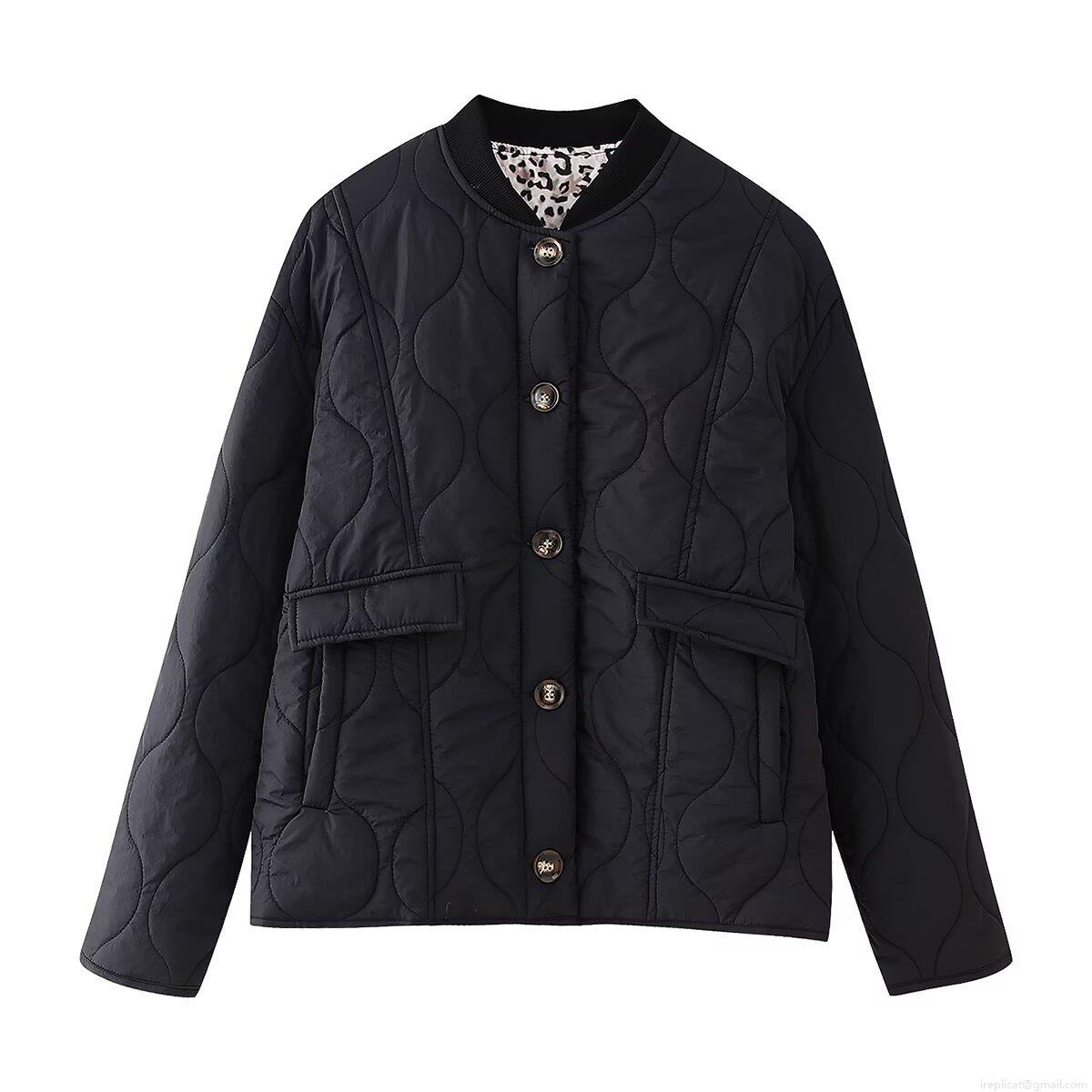 Solid Color, Quilting, Buttons, Leopard Print Lining, Wavy Quilting, Ribbed Neckline