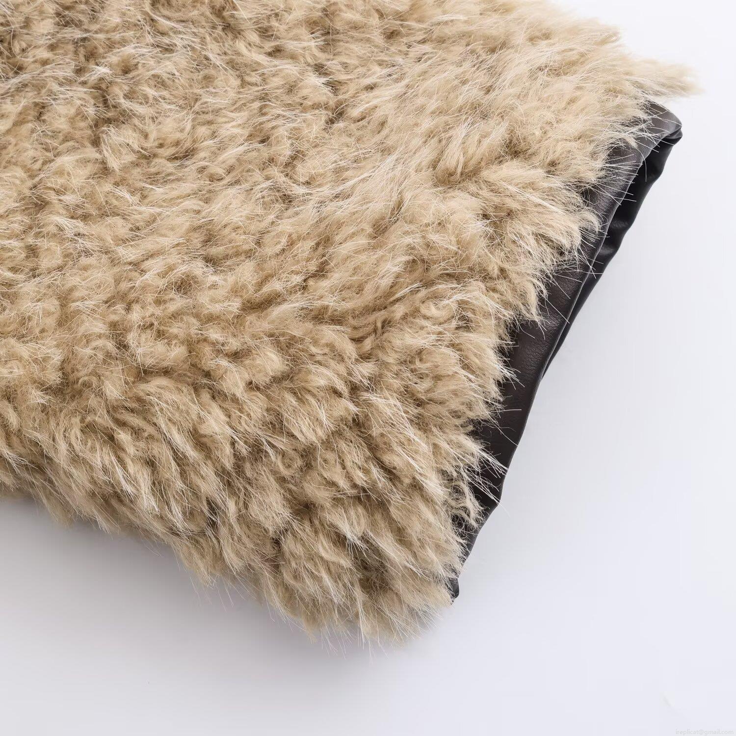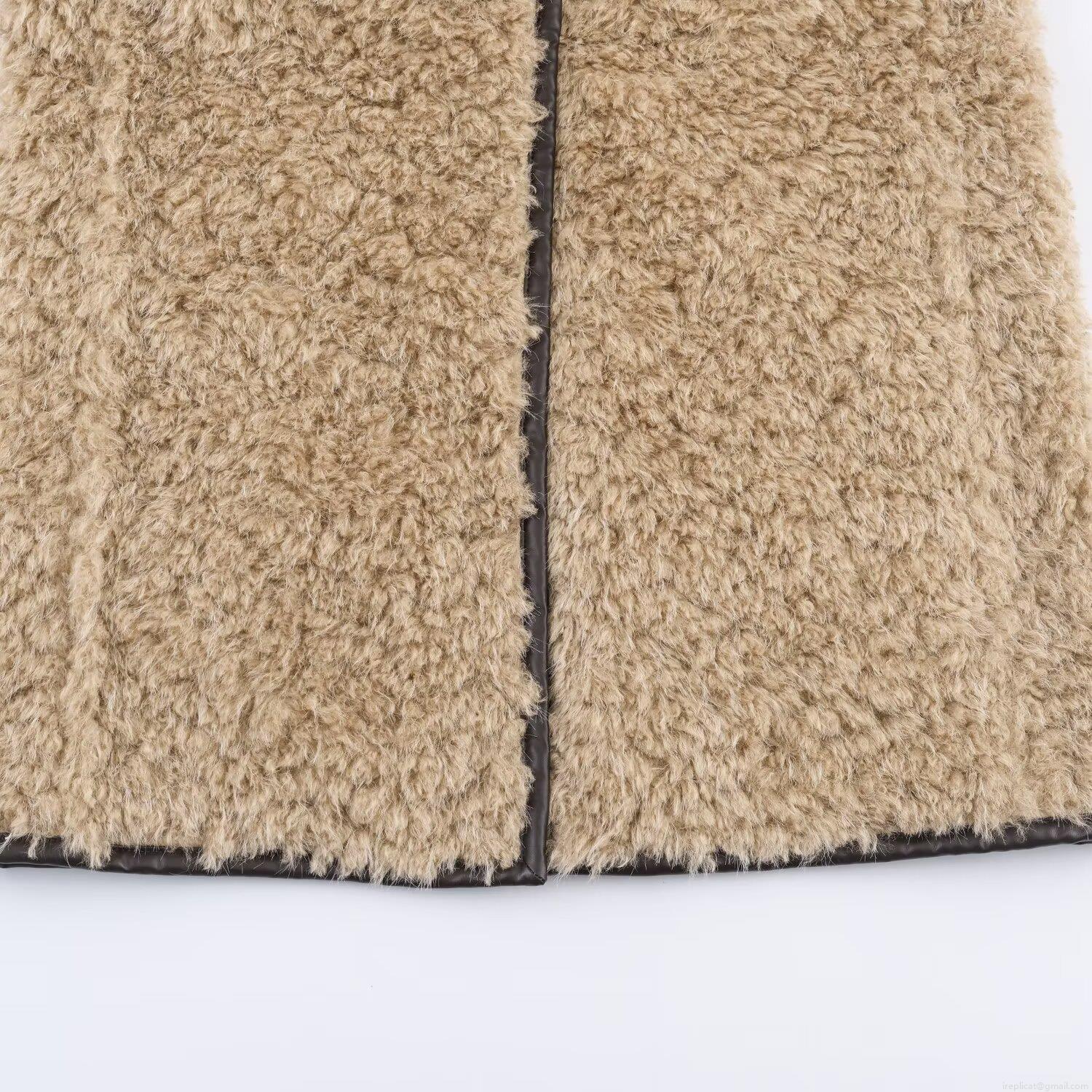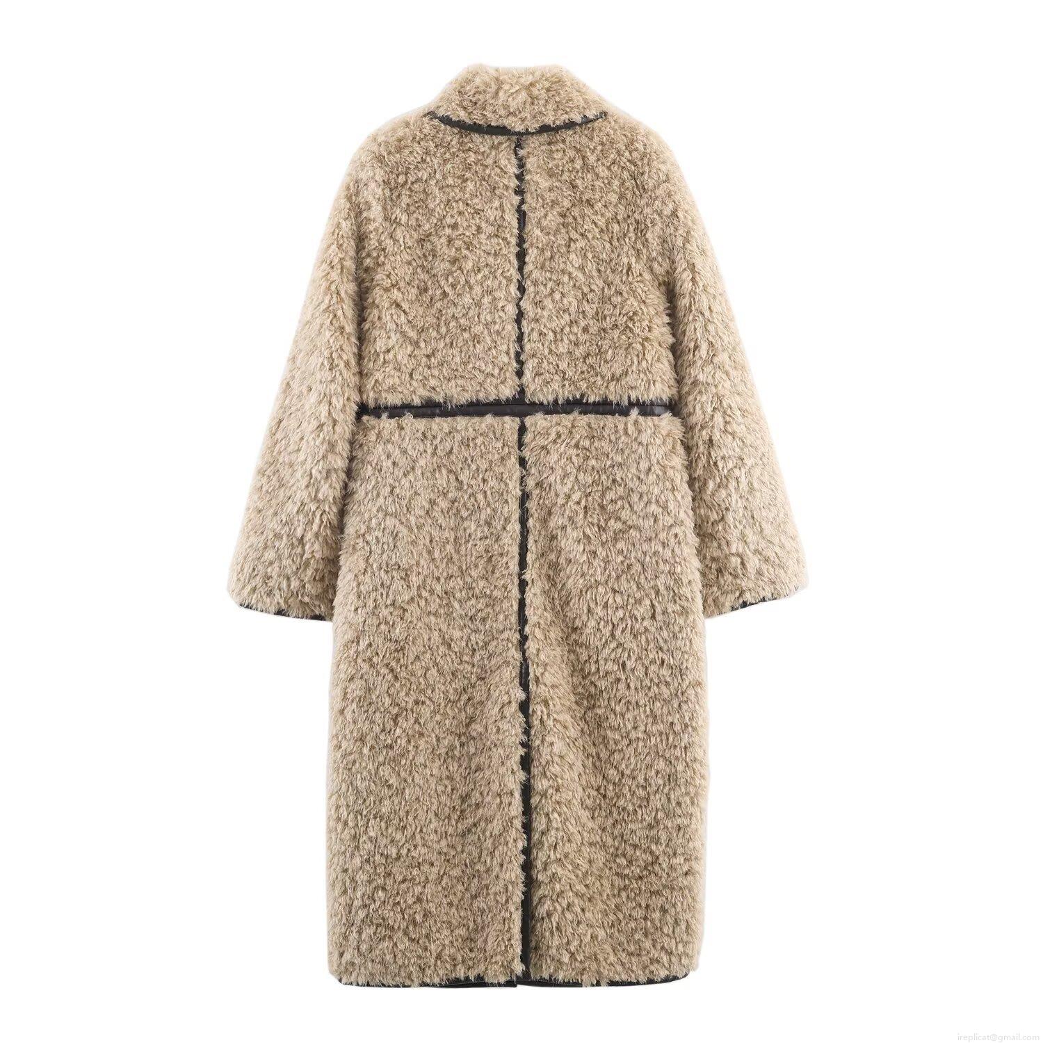 • Women's Winter Faux Shearling Long Coat Thick Warm Lapel Collar With Leather Piping Detail Loose Casual Solid Color Camel Plush Overcoat For Ladies