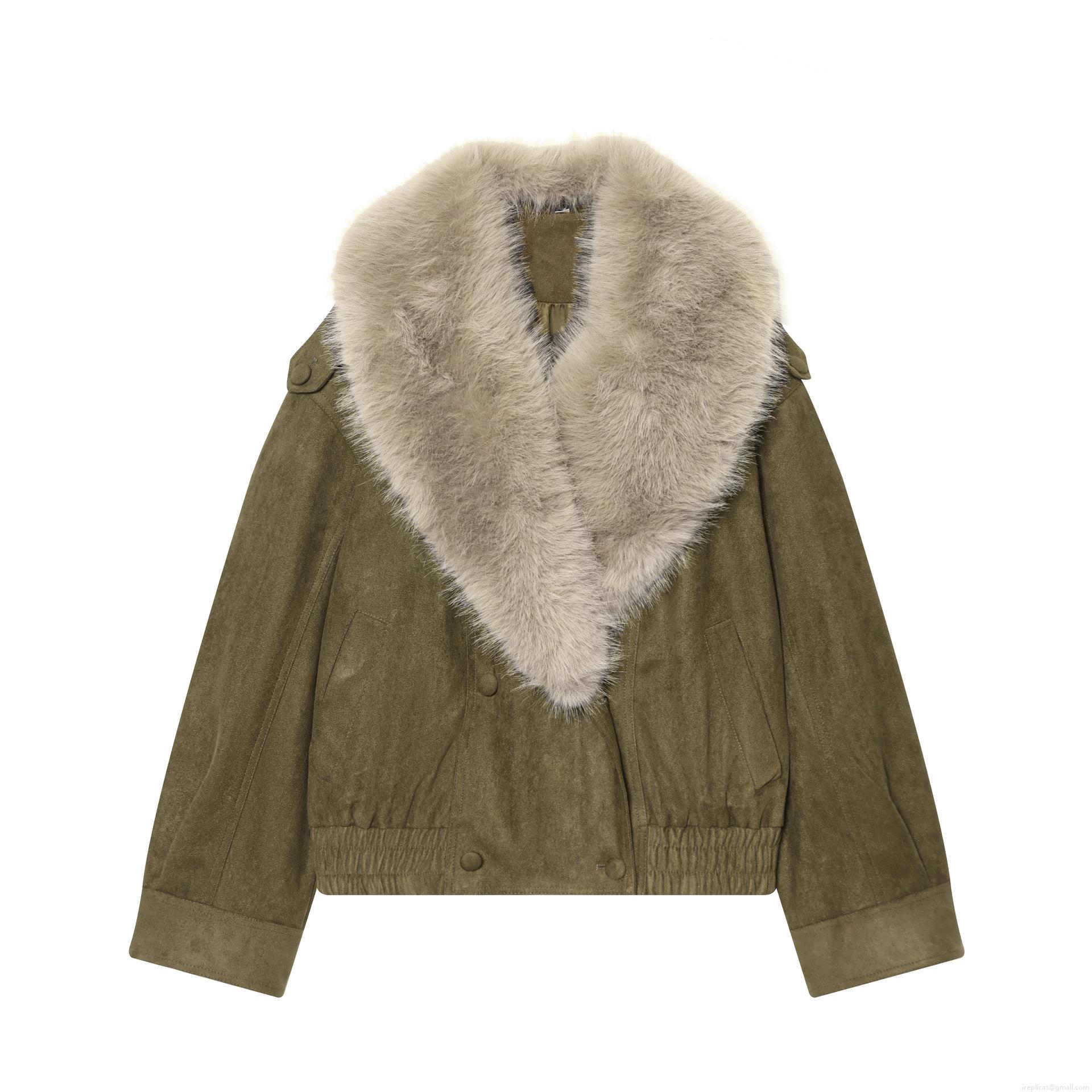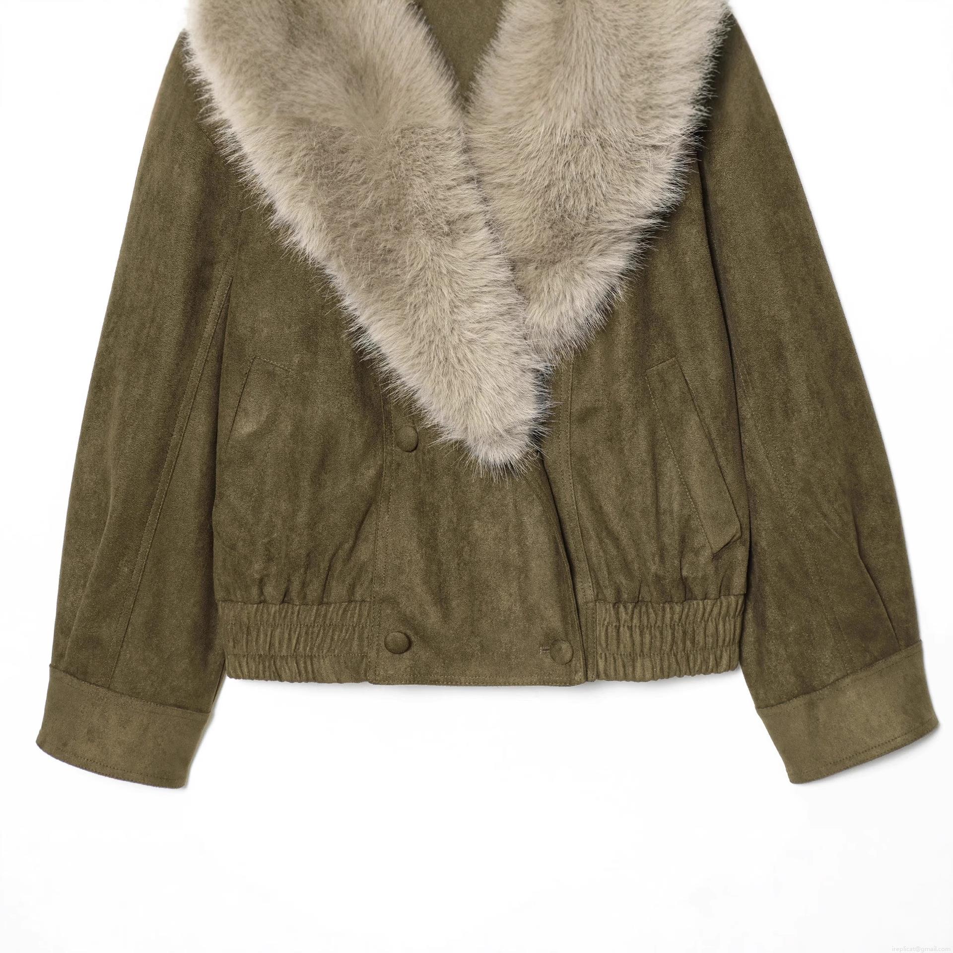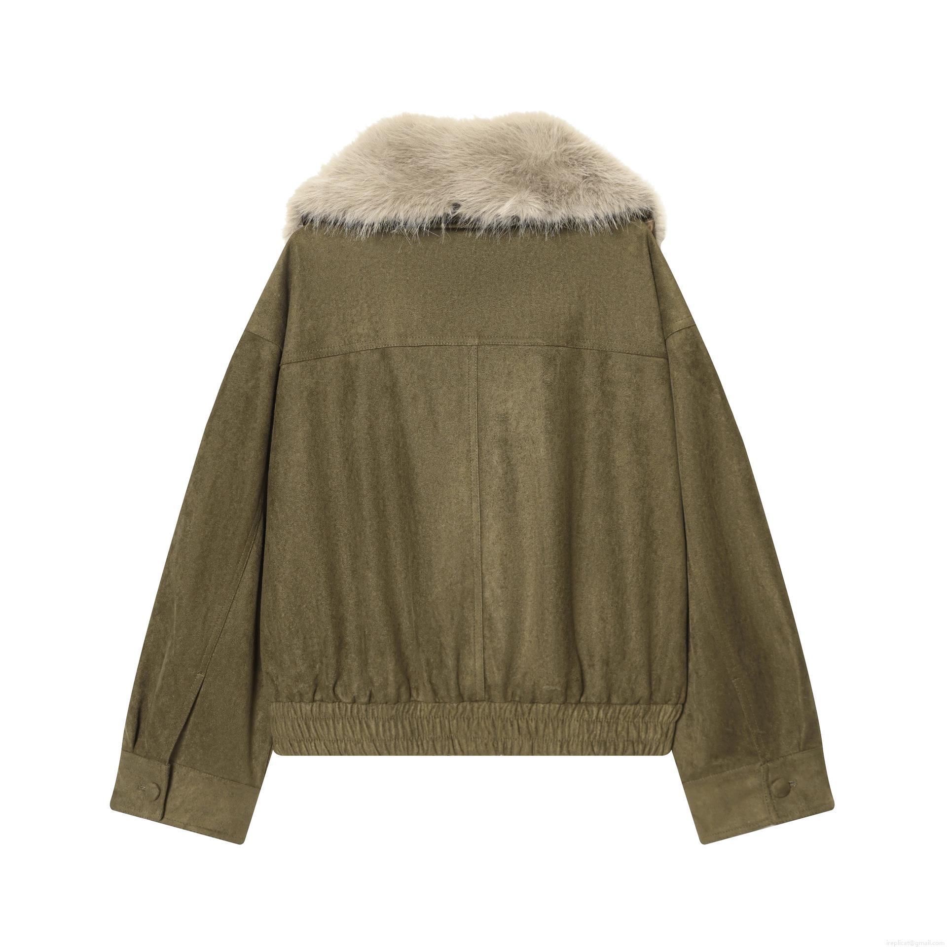 Women's Winter Faux Suede Jacket With Faux Fur Collar Olive Green Streetwear Cropped Zip Up Pocket Warm Outerwear For Ladies