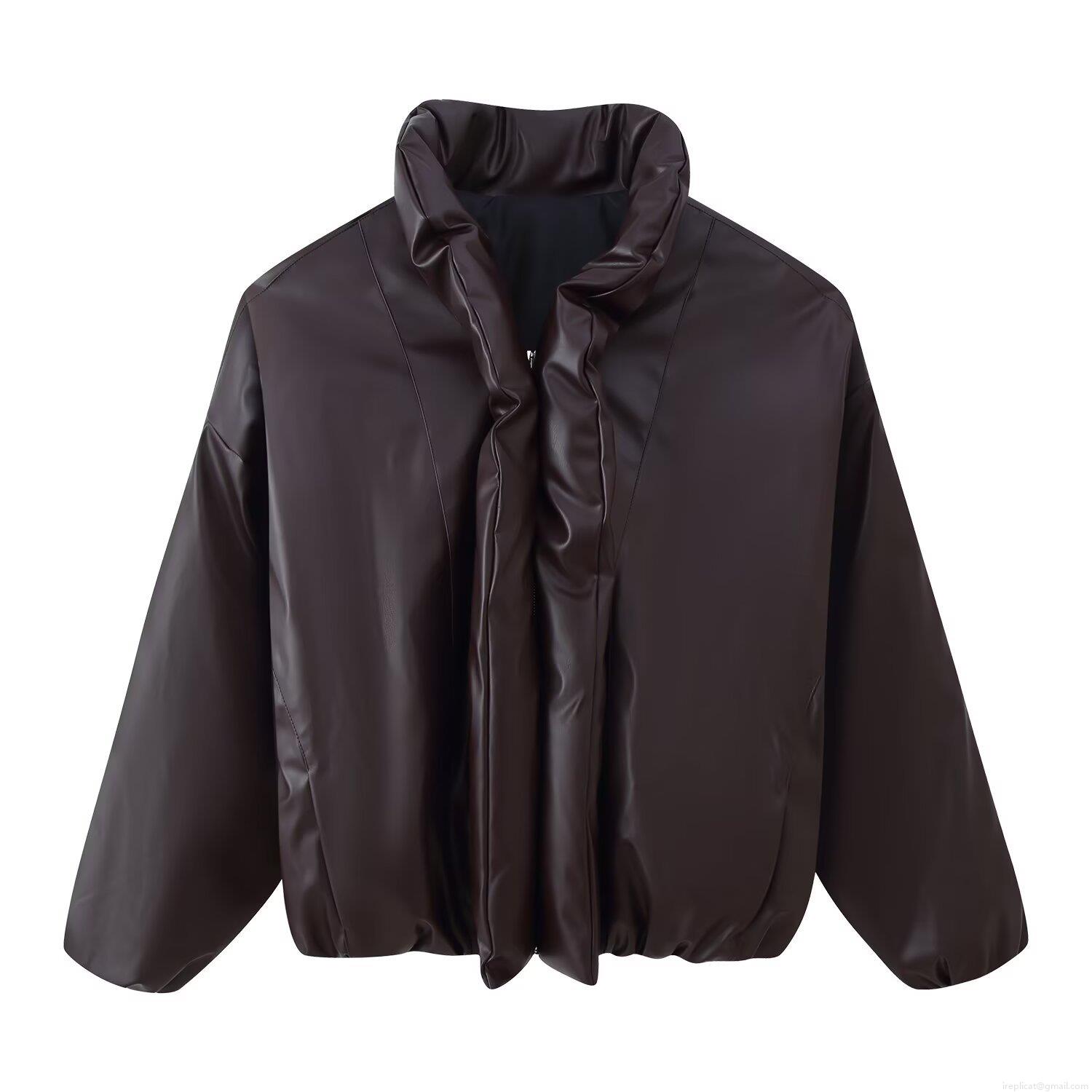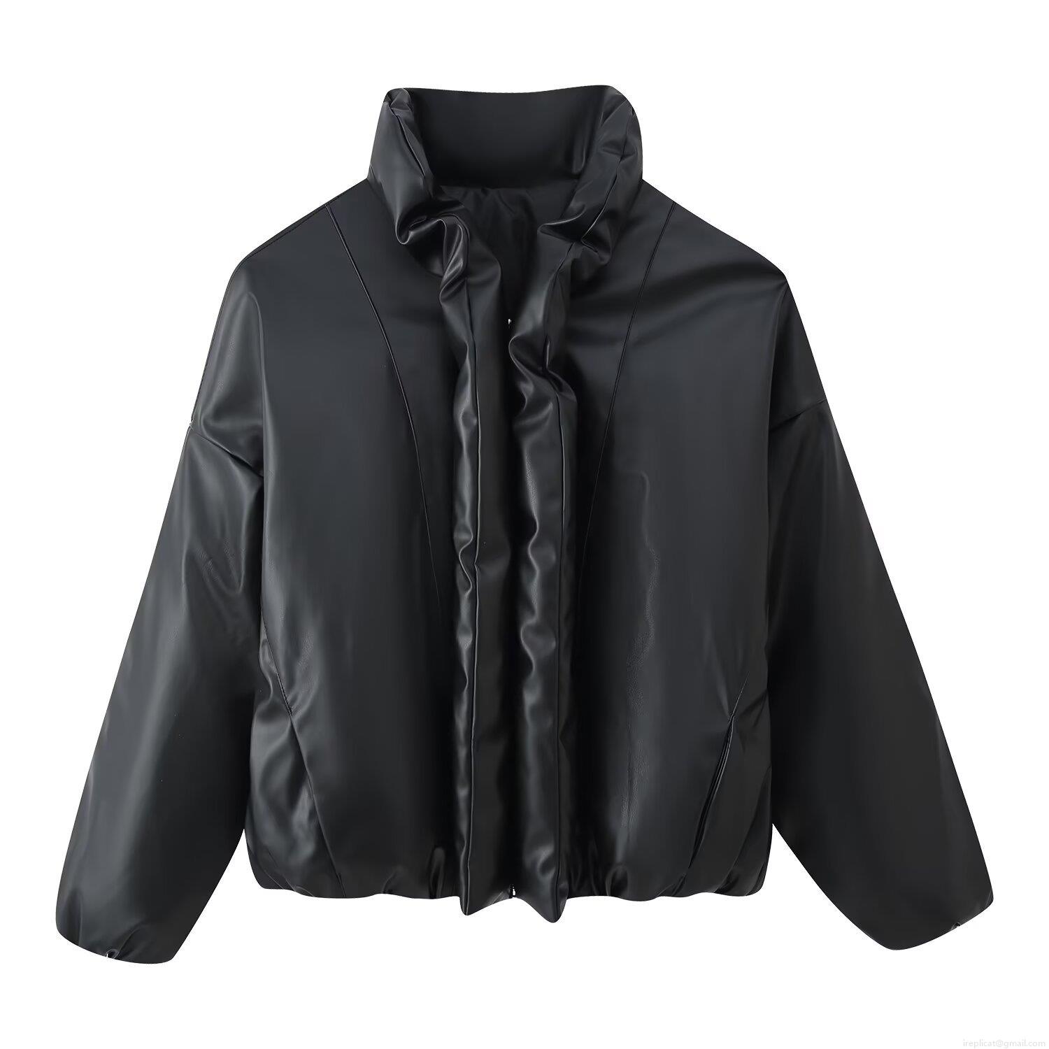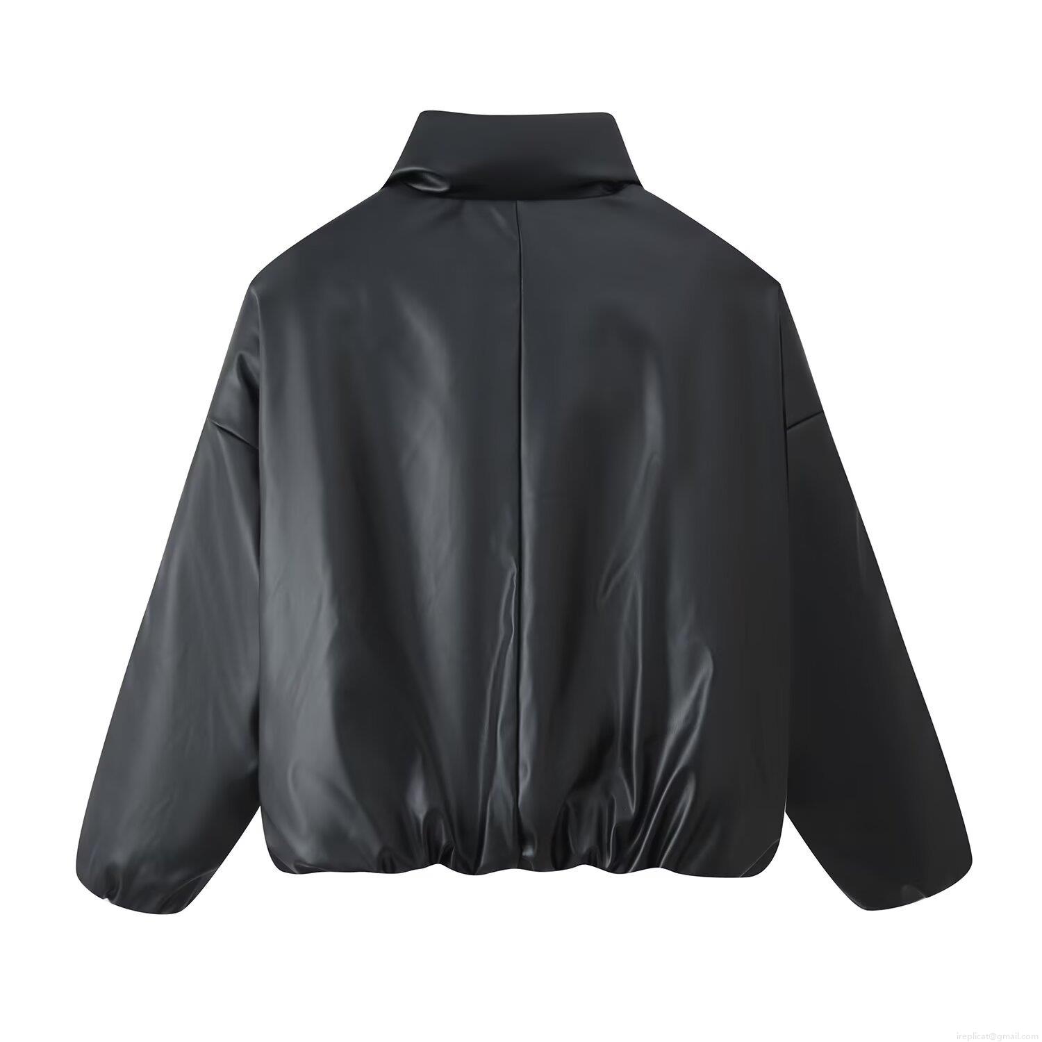• Women's Winter Oversized PU Faux Leather Padded Jacket Stand Collar Zip Up Warm Windproof Puffer Outerwear Splicing Streetwear Coat