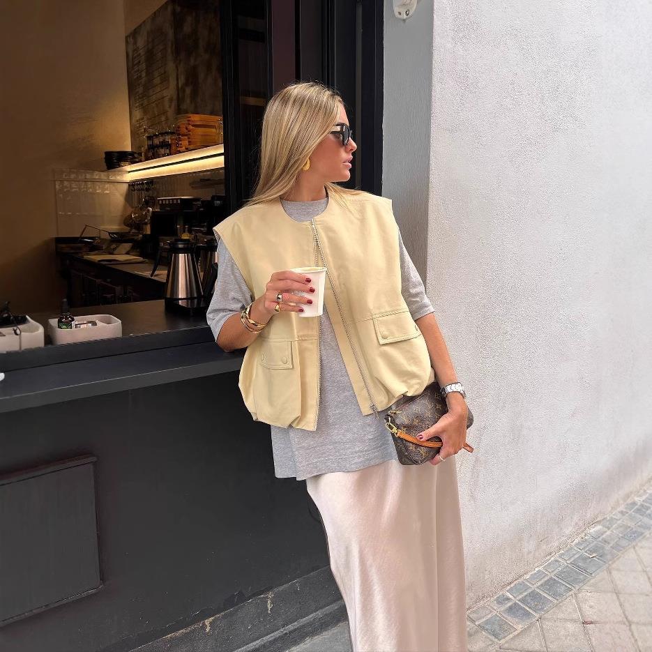 • Women's Workwear Sleeveless Vest Jacket Loose Fit Polyester Zip Up Waistcoat Pockets Ruffled Hem Solid Color Streetwear Outerwear Ladies Casual Daily Wear