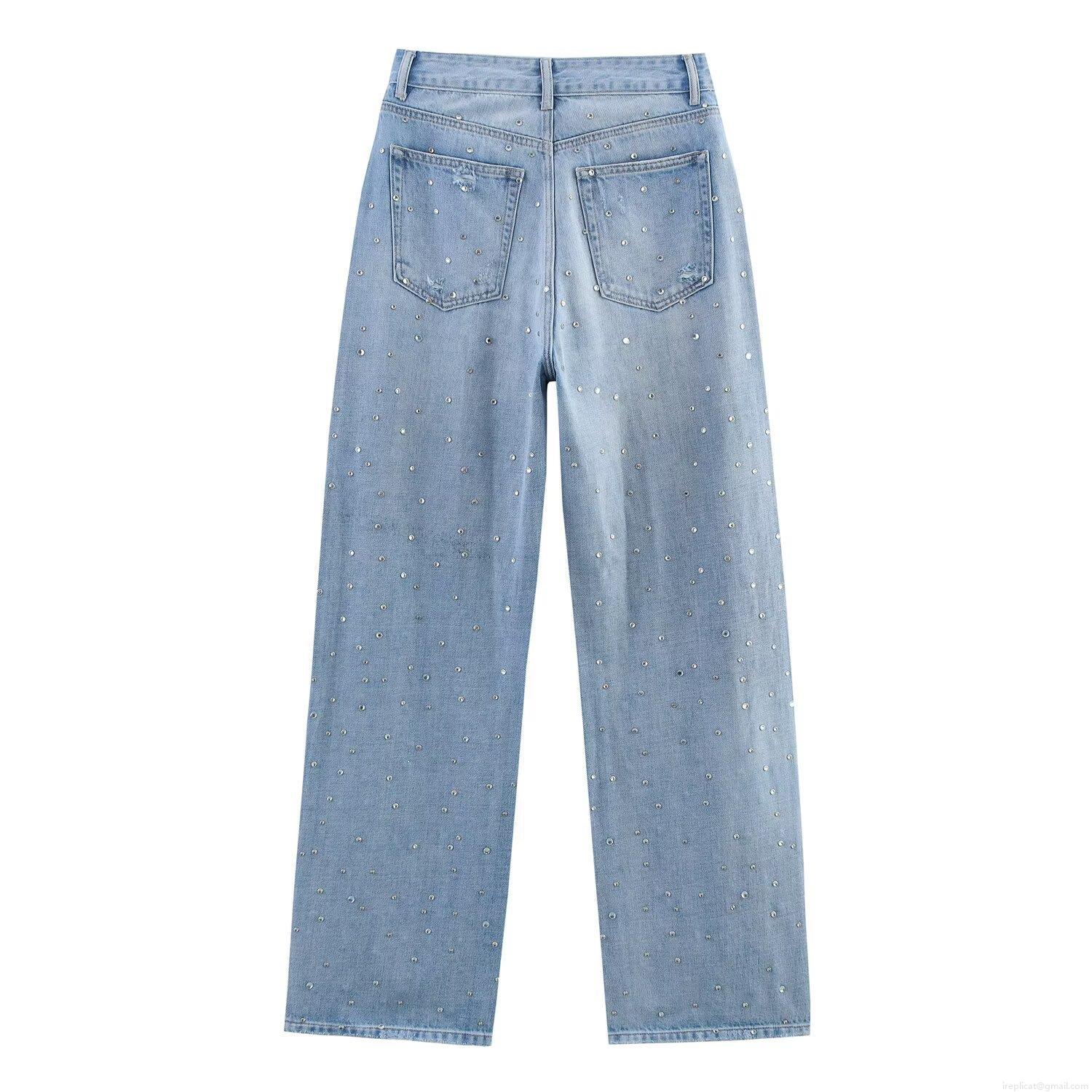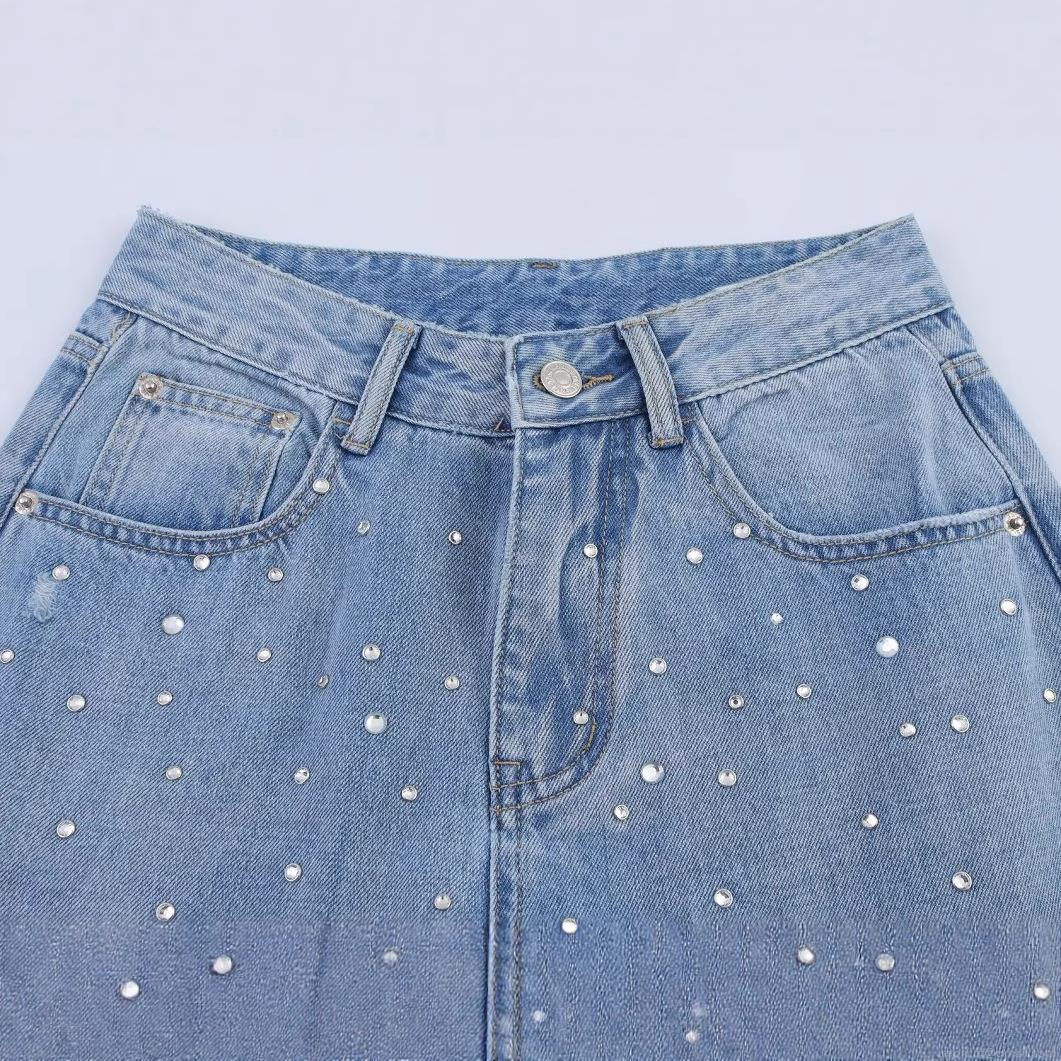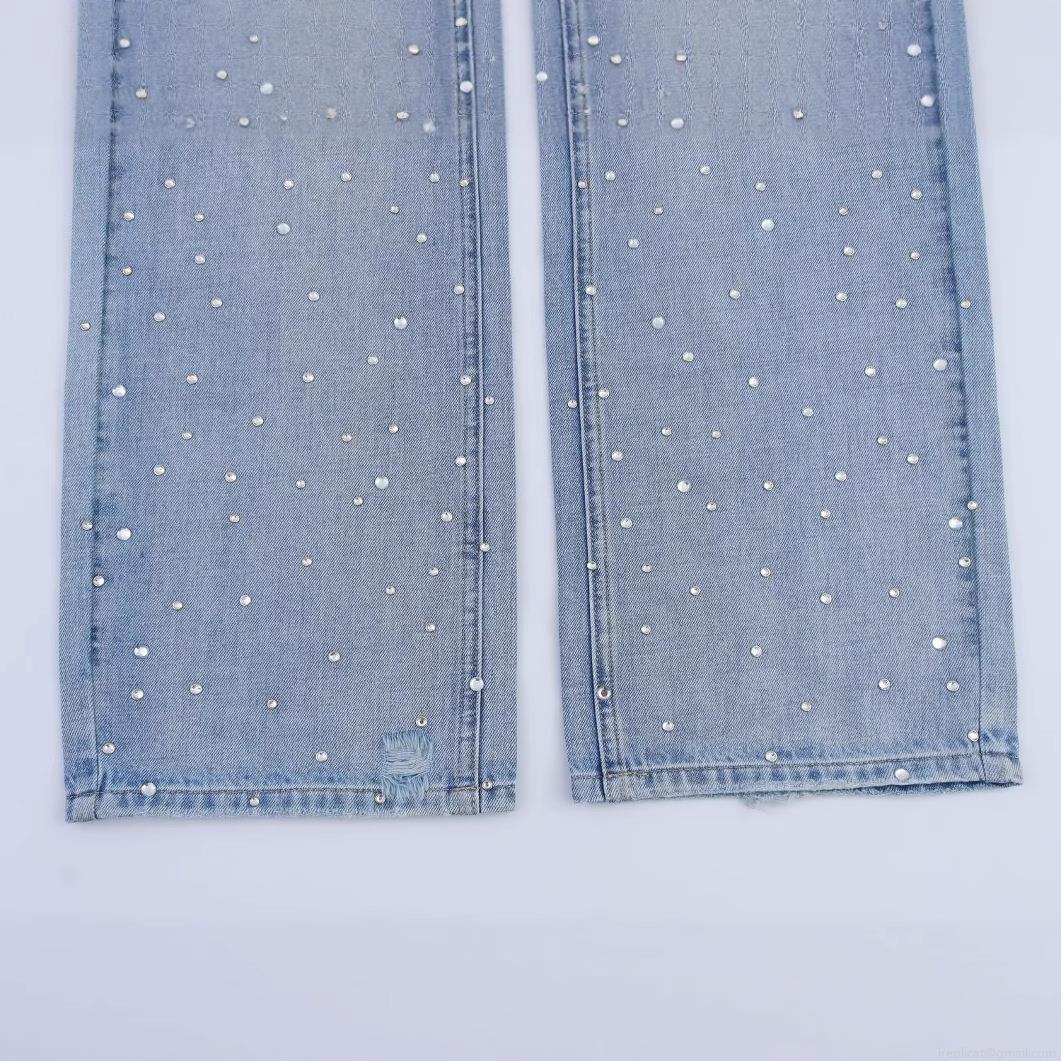 High Waist Straight Leg Jeans With Rhinestones Light Blue Distressed Denim Pants For Women Vintage Boho Style Streetwear Trousers Fashion