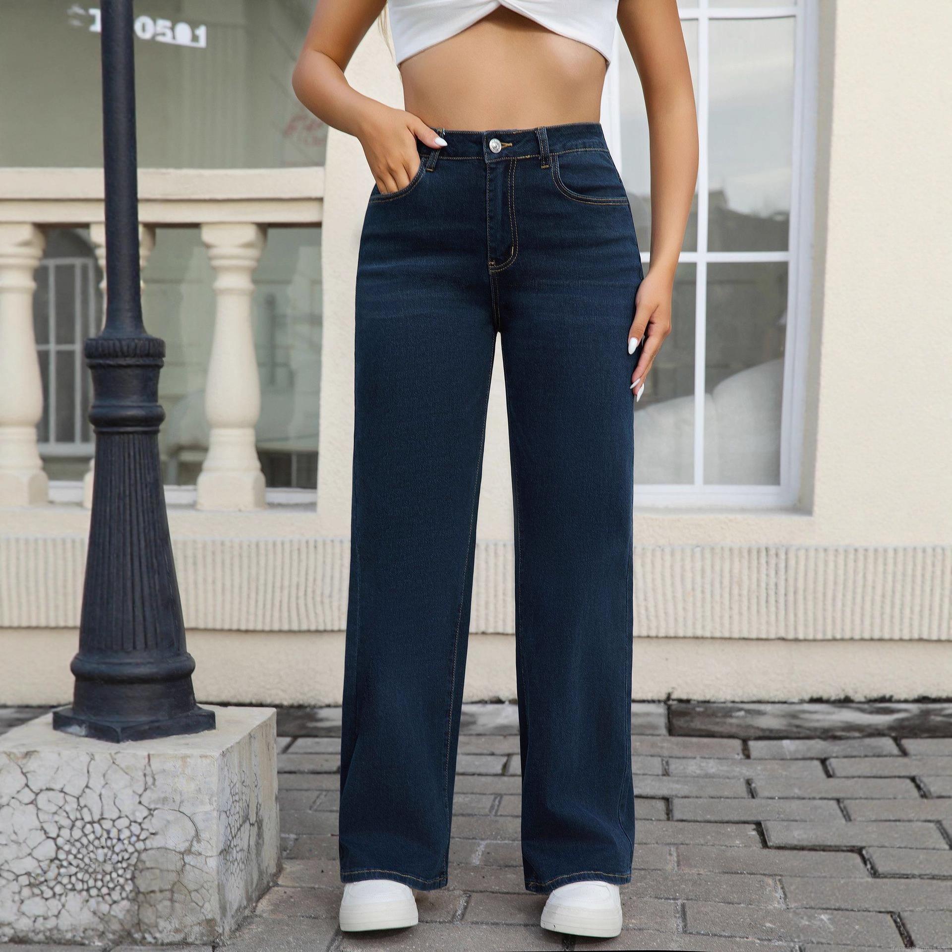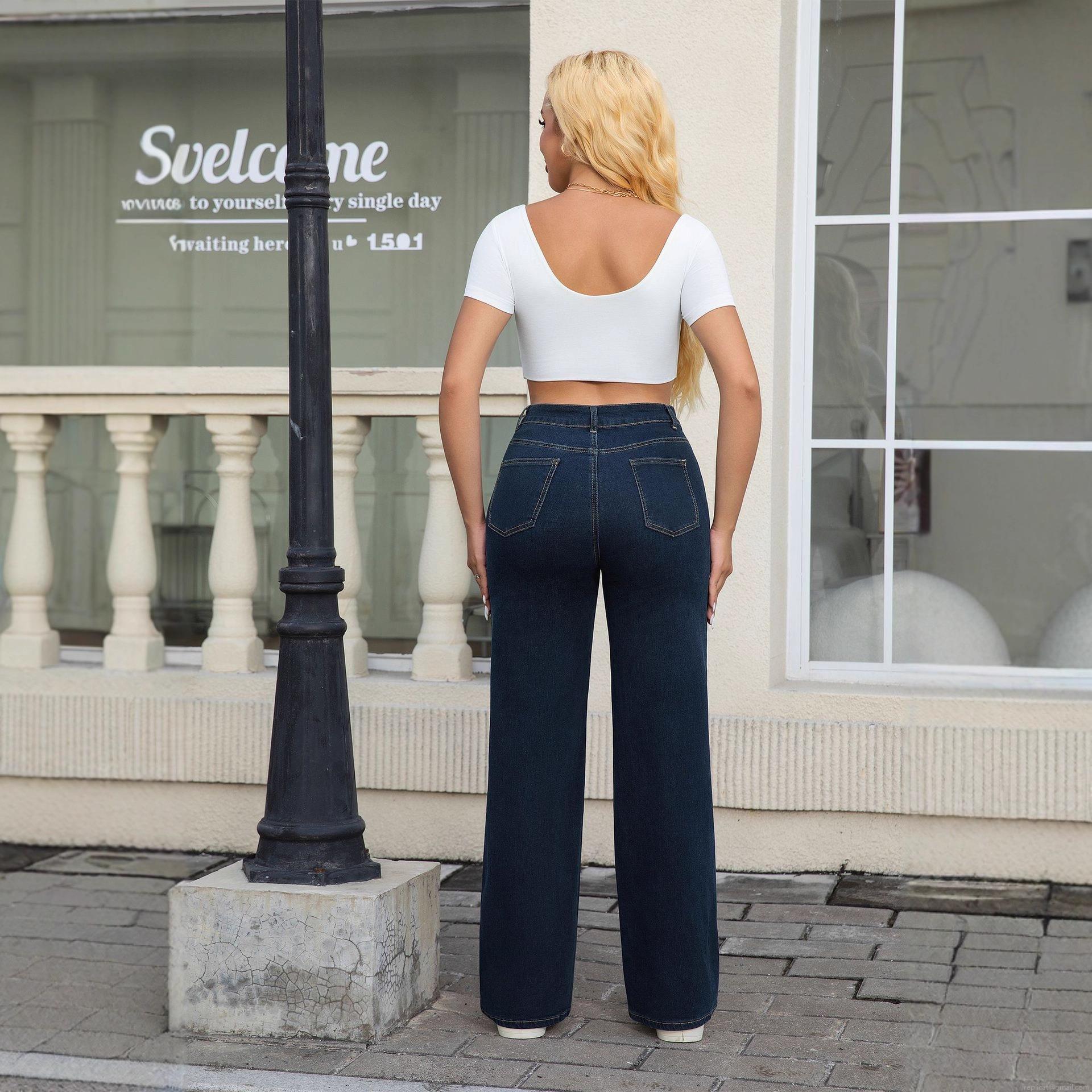 • High Waisted Wide Leg Jeans For Women Vintage Deep Blue Straight Denim Long Pants Commute Casual Slimming Cotton Blend Trousers