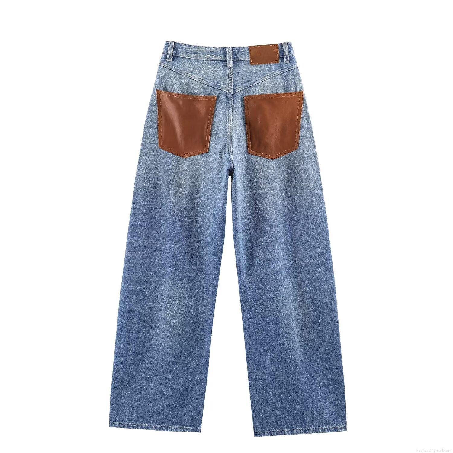 • High Waisted Wide Leg Jeans With Brown Leather Pockets Washed Blue Denim Pants Retro Casual Straight Leg Trousers For Women Streetwear Fashion Loose Denim Bottoms