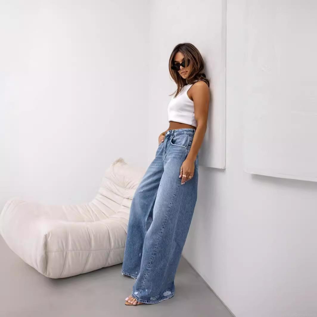 Women American Retro High Waist Wide Leg Jeans Distressed Ripped Hole Cotton Blend Denim Pants Streetwear Loose Long Trousers