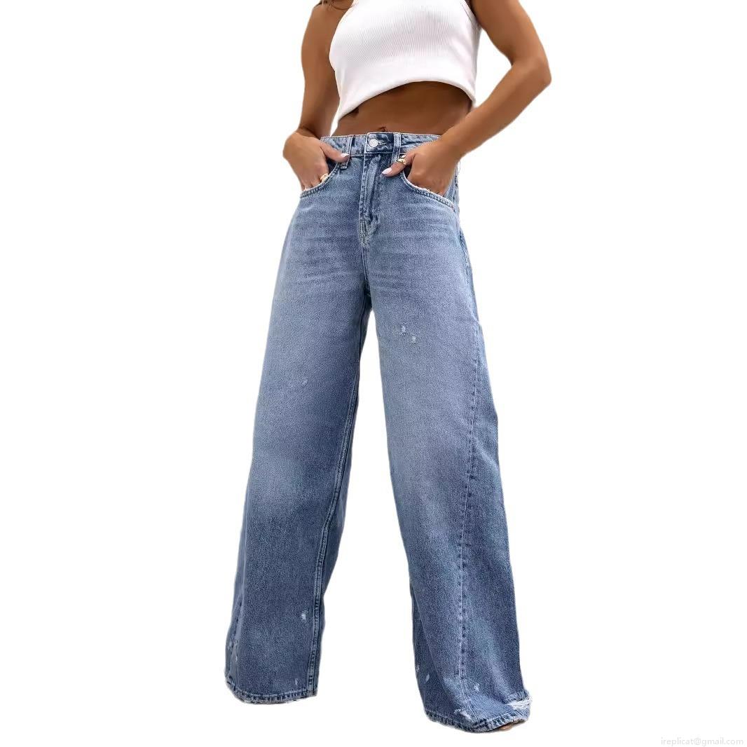 • Women American Retro High Waist Wide Leg Jeans Distressed Ripped Hole Cotton Blend Denim Pants Streetwear Loose Long Trousers