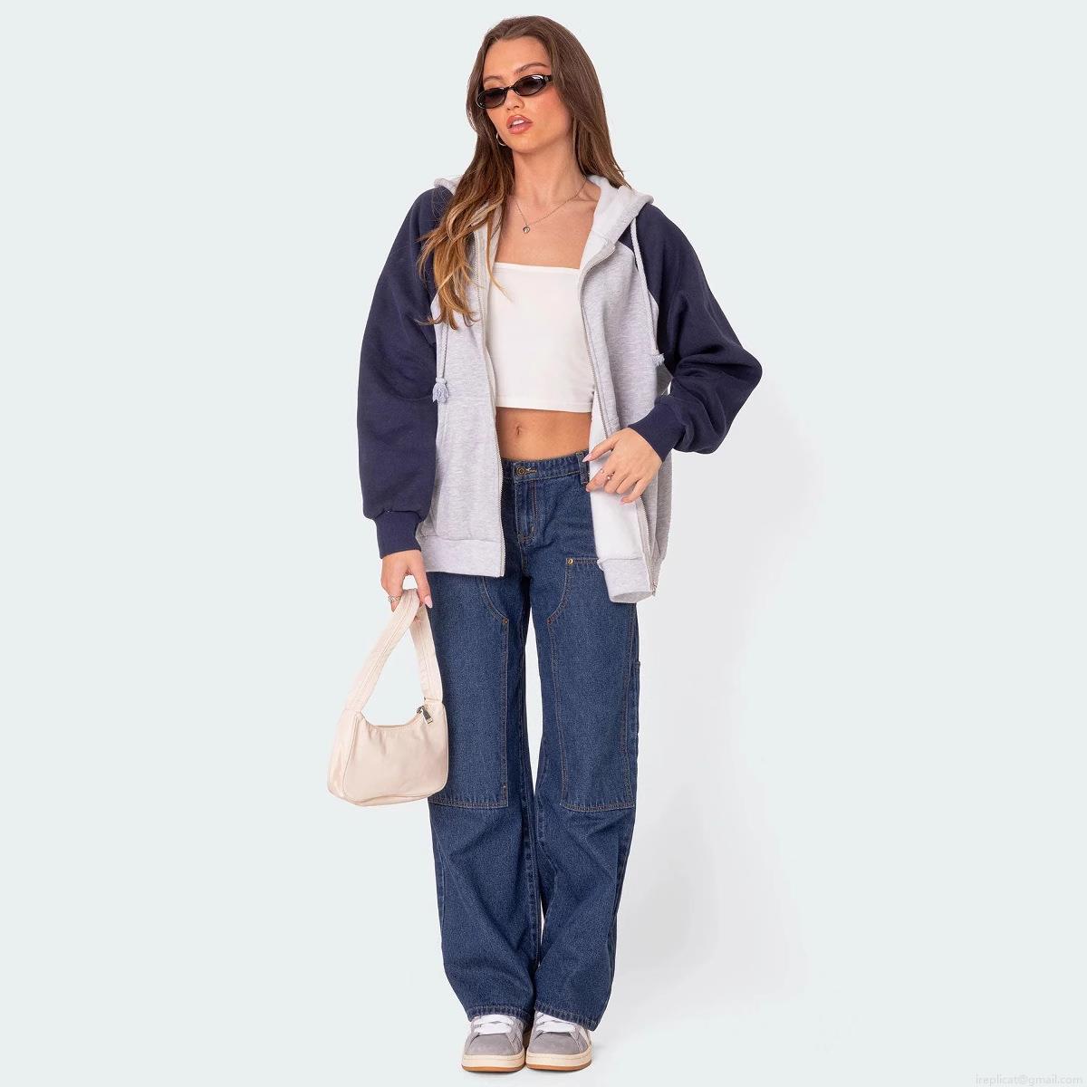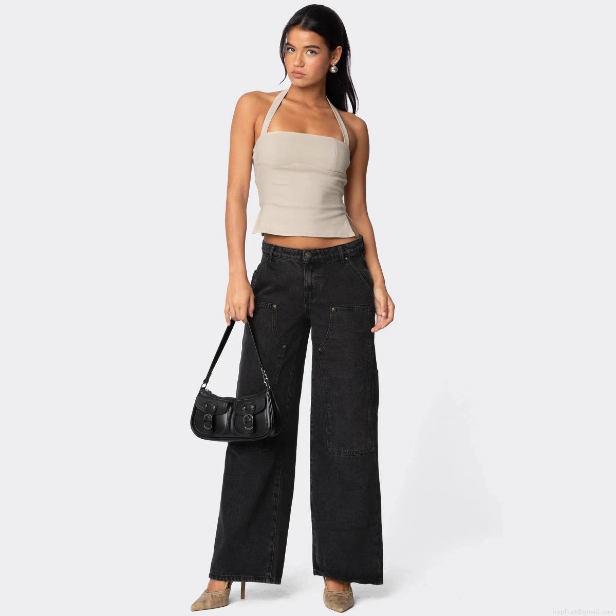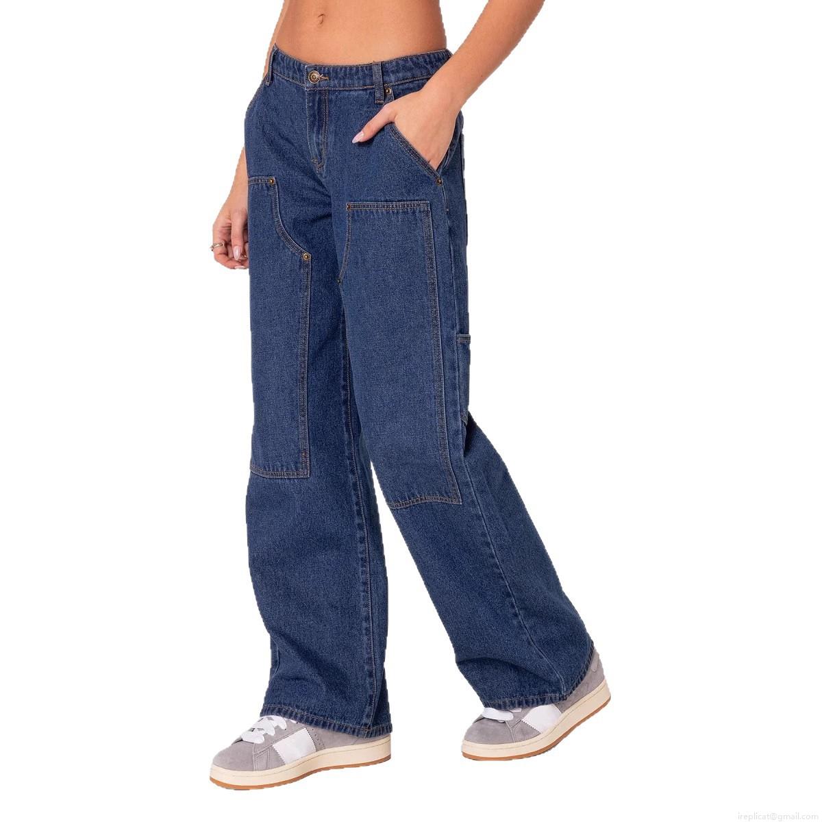 • Women Cargo Jeans Double Knee Rivets Wide Leg Straight Denim Pants Streetwear Loose Fit Distressed Denim Trousers For Women