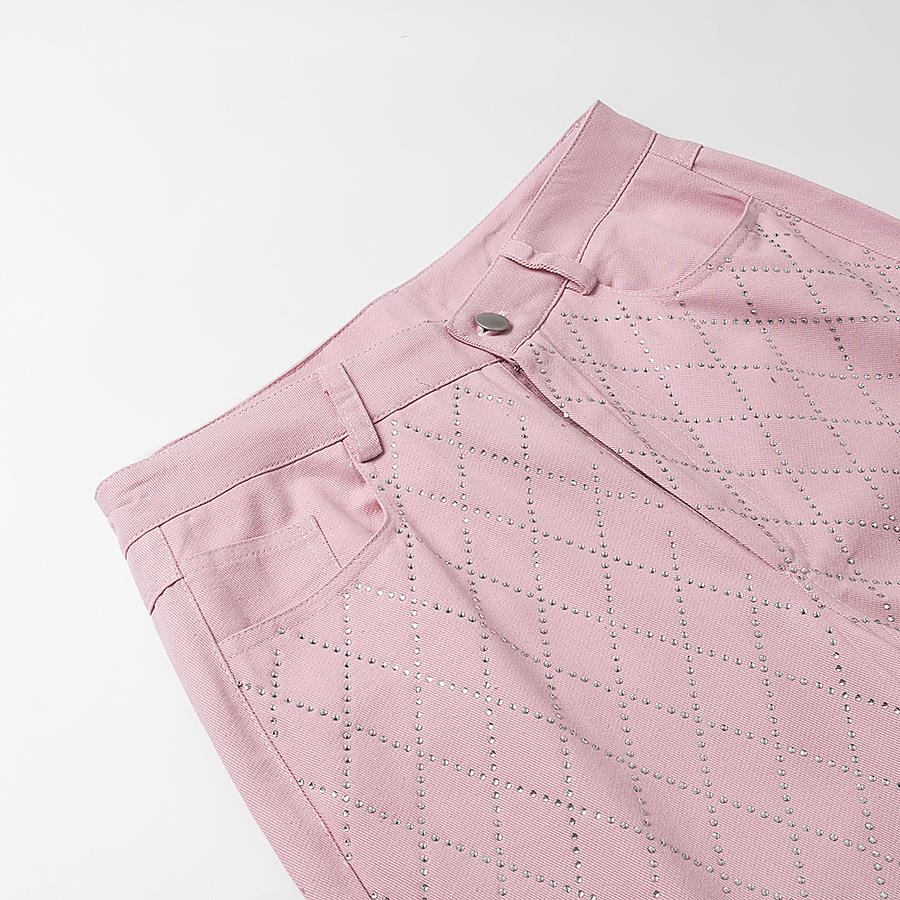 • Women Fashion Pink High Waist Straight Leg Jeans With Rhinestone Diamond Grid Pattern Casual Denim Long Pants For Party Streetwear Lady