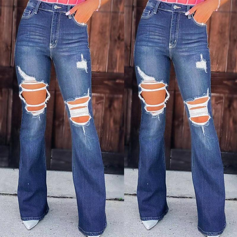 Women High Waist Ripped Flare Jeans Distressed Denim Bell Bottom Pants Casual Streetwear Blue Wash Long Trousers Polyester Denim With Handmade Ripped Details