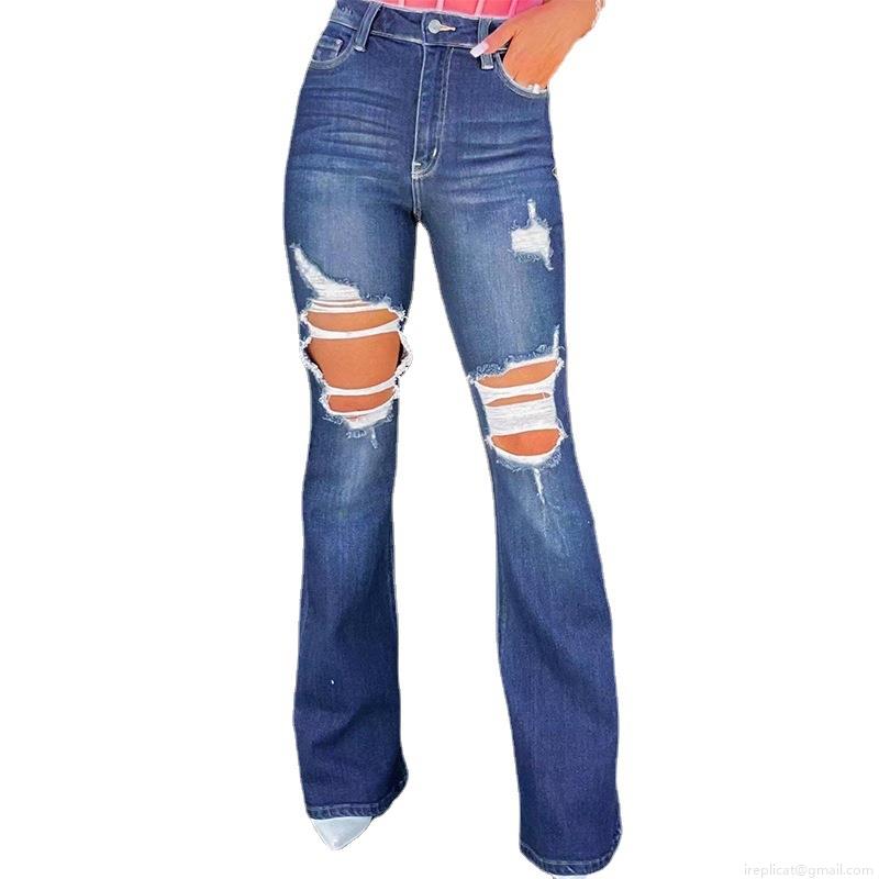 • Women High Waist Ripped Flare Jeans Distressed Denim Bell Bottom Pants Casual Streetwear Blue Wash Long Trousers Polyester Denim With Handmade Ripped Details