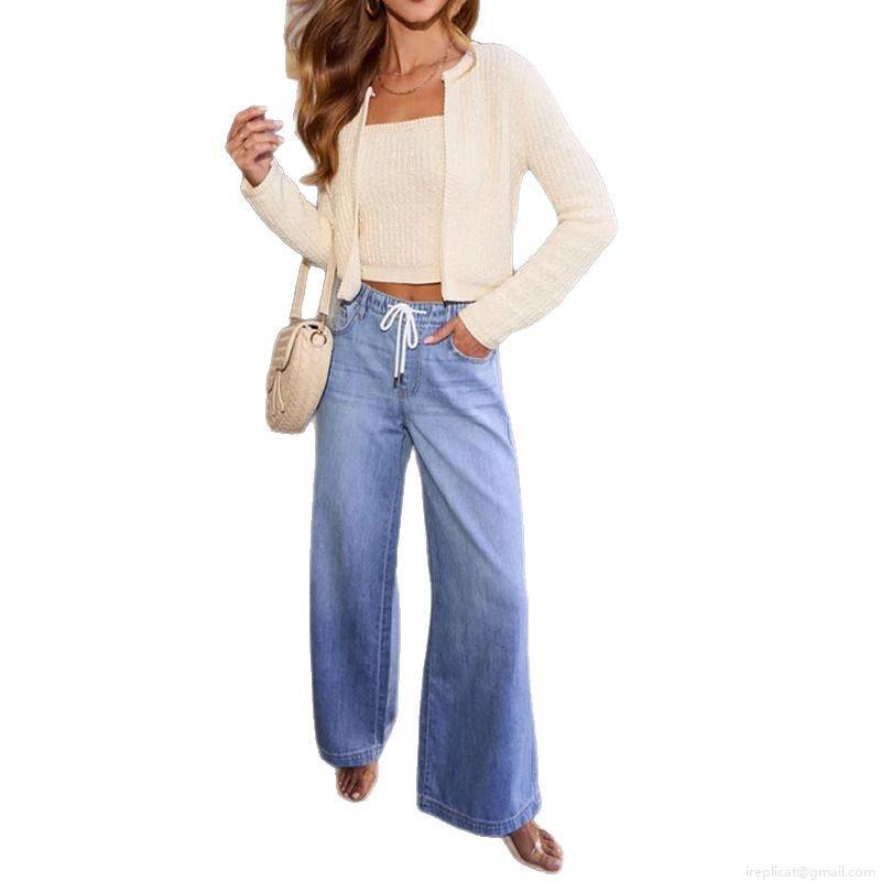 • Women High Waist Wide Leg Denim Pants Drawstring Elastic Waist Loose Jeans Light Blue Washed Long Trousers Streetwear Casual Fashion Bottoms for Ladies
