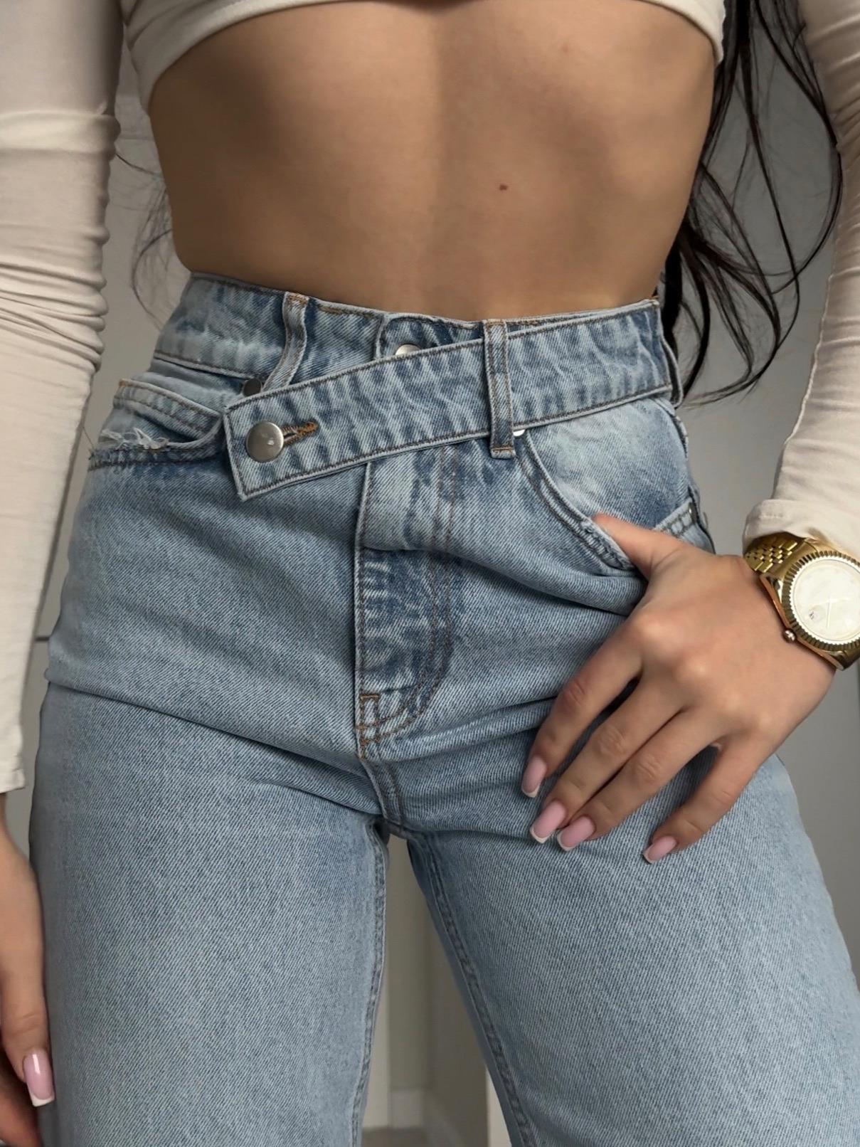 • Women High Waist Wide Leg Jeans Asymmetric Criss Cross Waistband Distressed Denim Pants Side Split Hem Streetwear Fashion Long Trousers