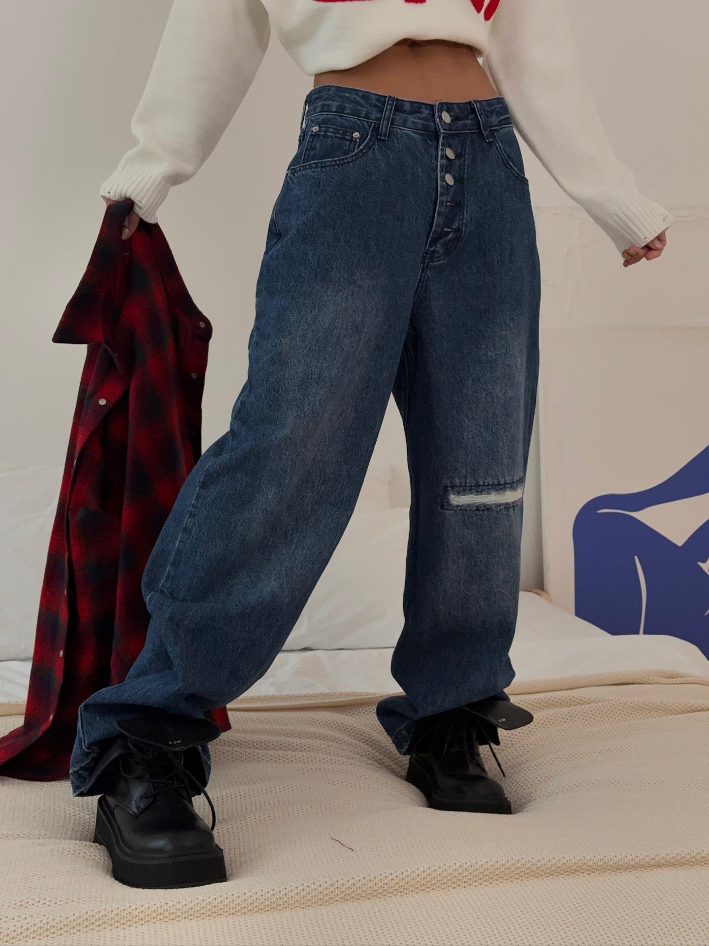 • Women Retro High Waist Wide Leg Denim Jeans Distressed Ripped Hole Loose Straight Baggy Long Trousers Casual Streetwear Cotton Blend Pants