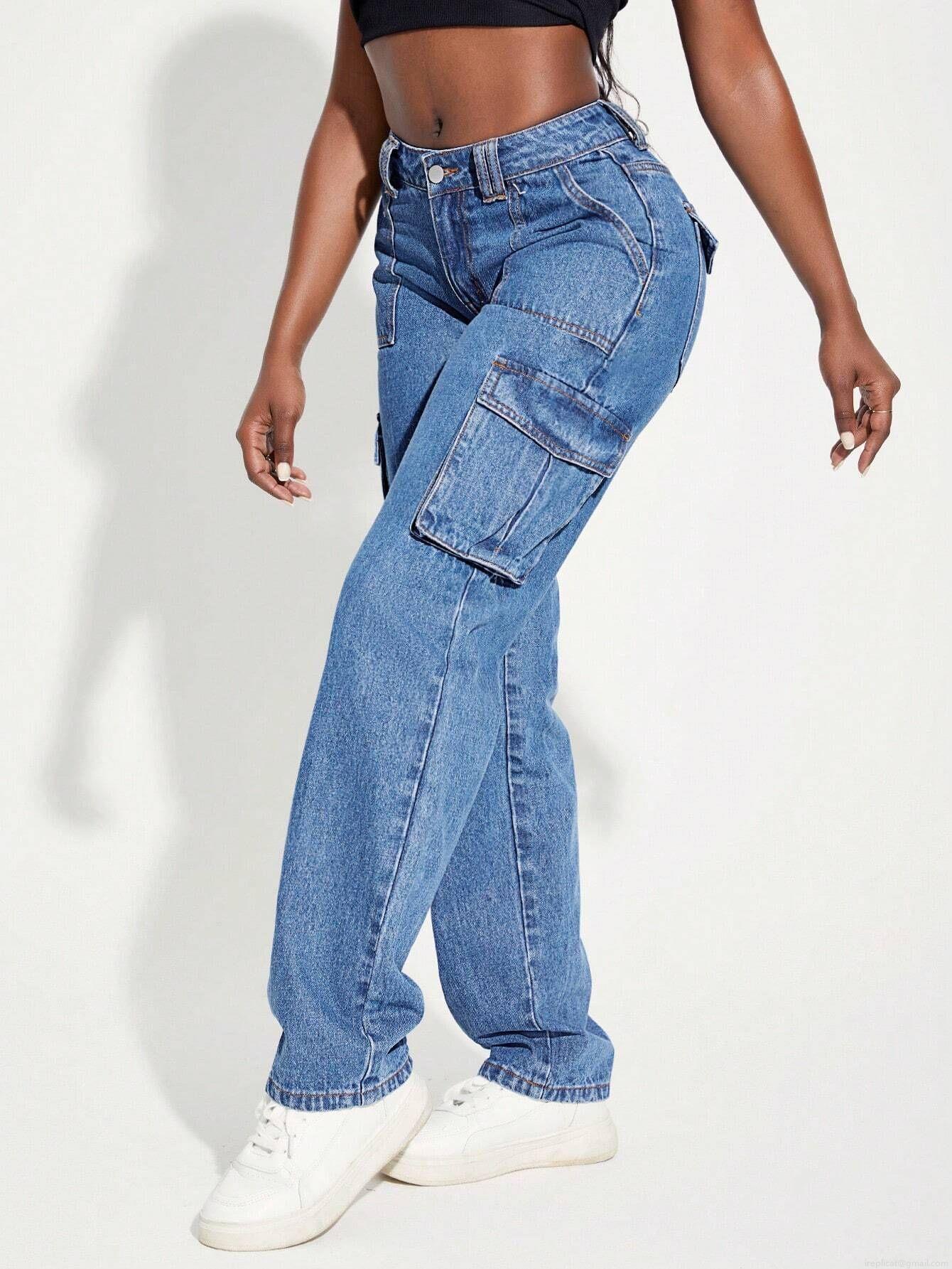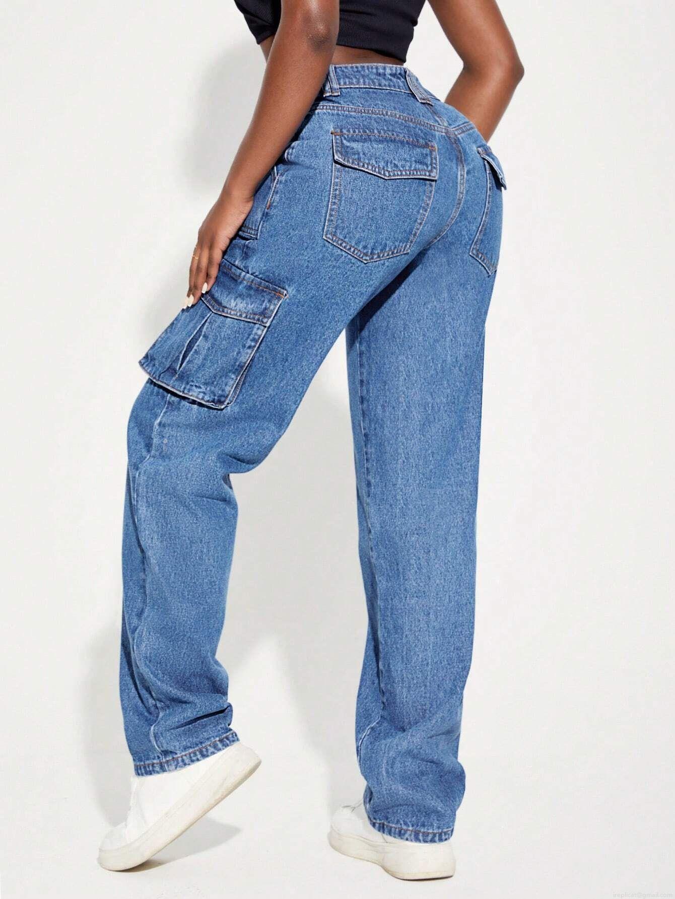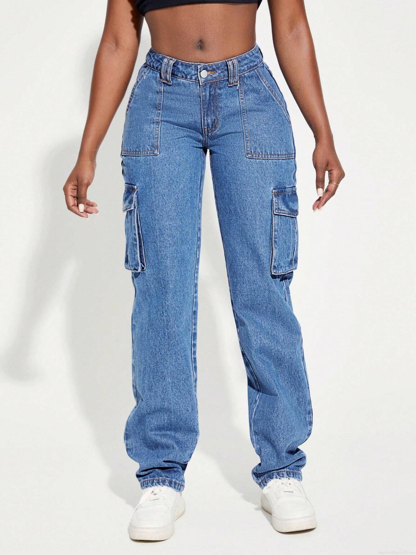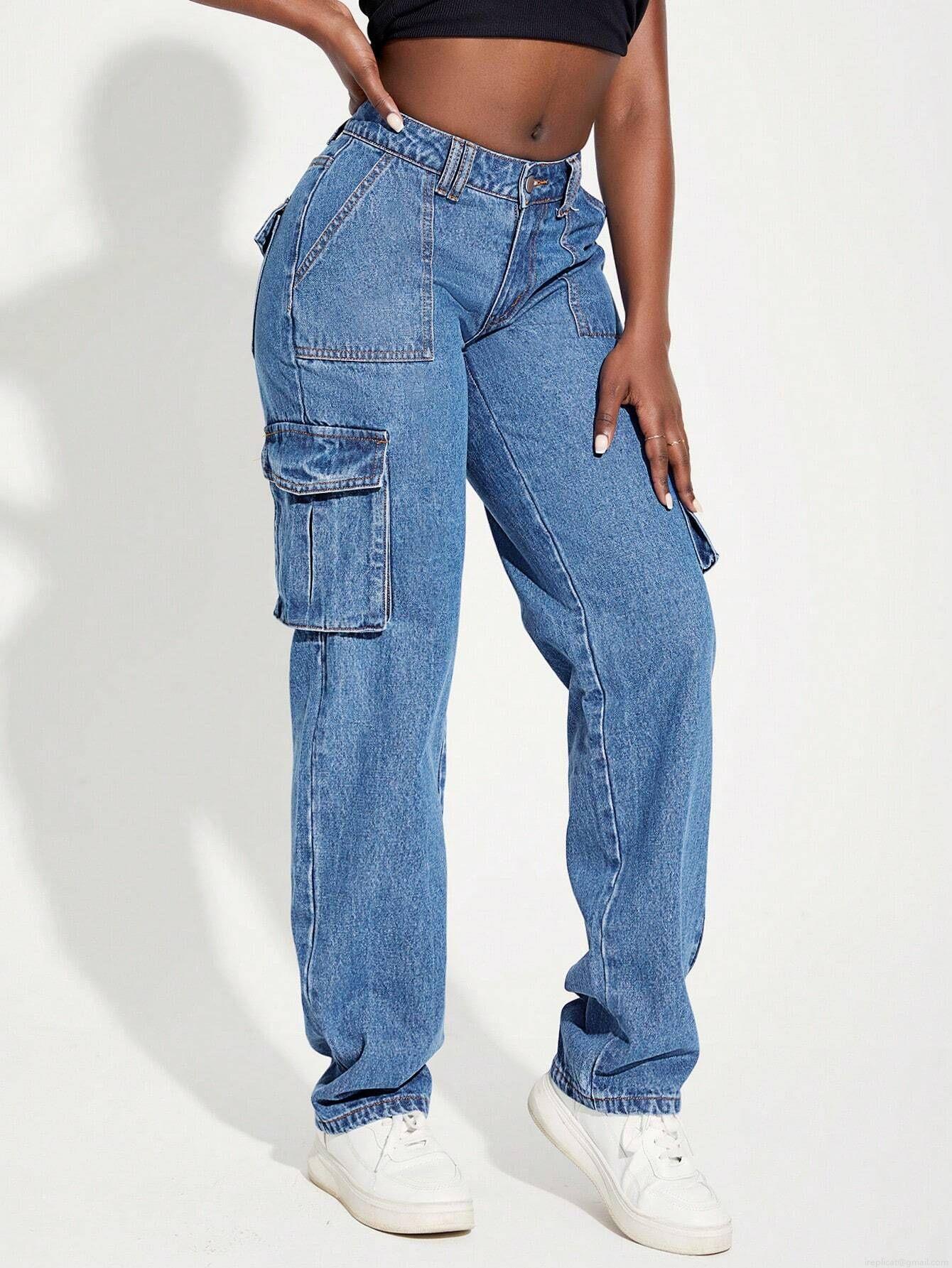 • Women's American Retro High Waist Cargo Jeans Multi-pocket Straight Leg Denim Pants Streetwear Washed Blue Baggy Cotton Blend Trouser