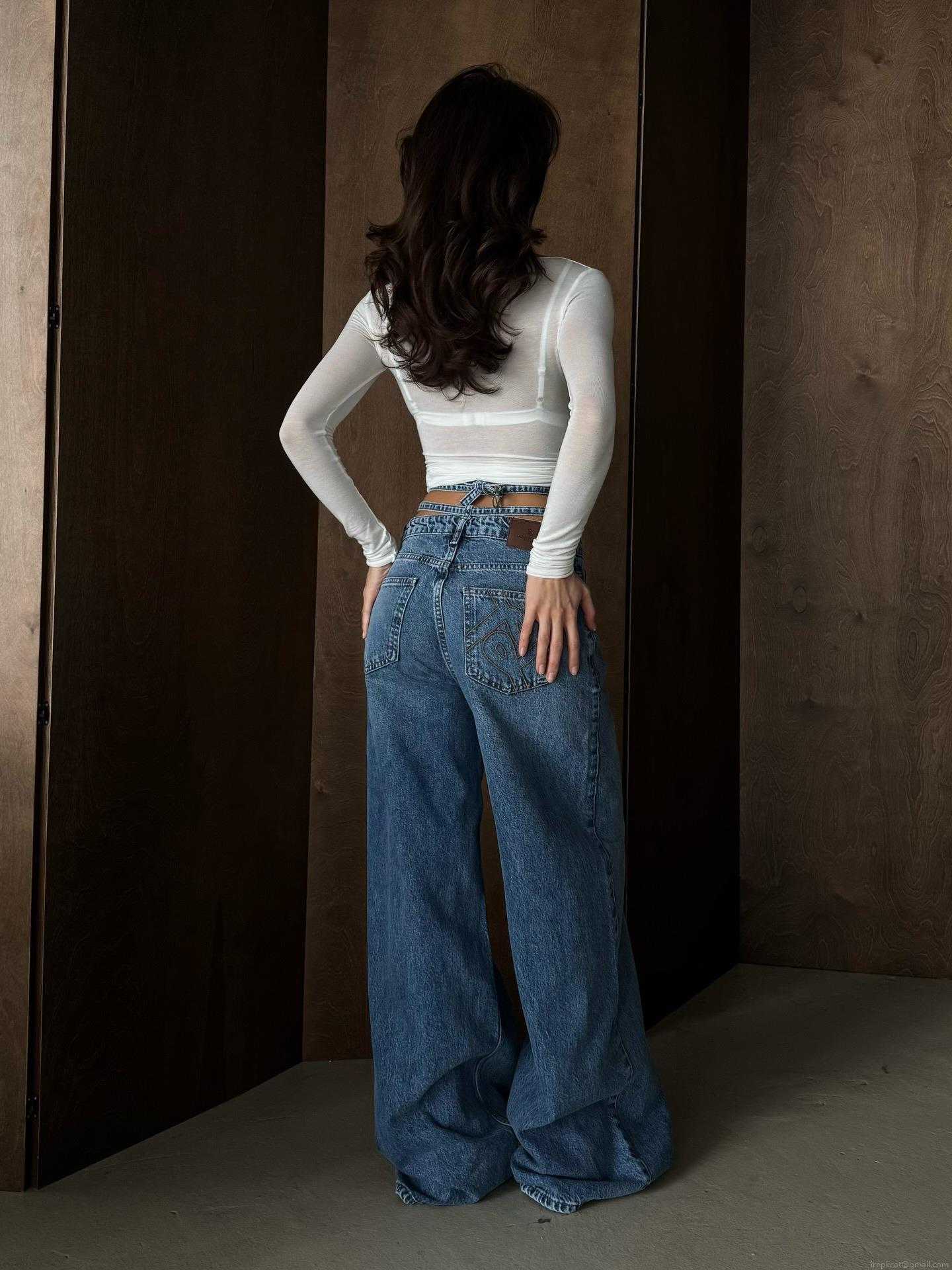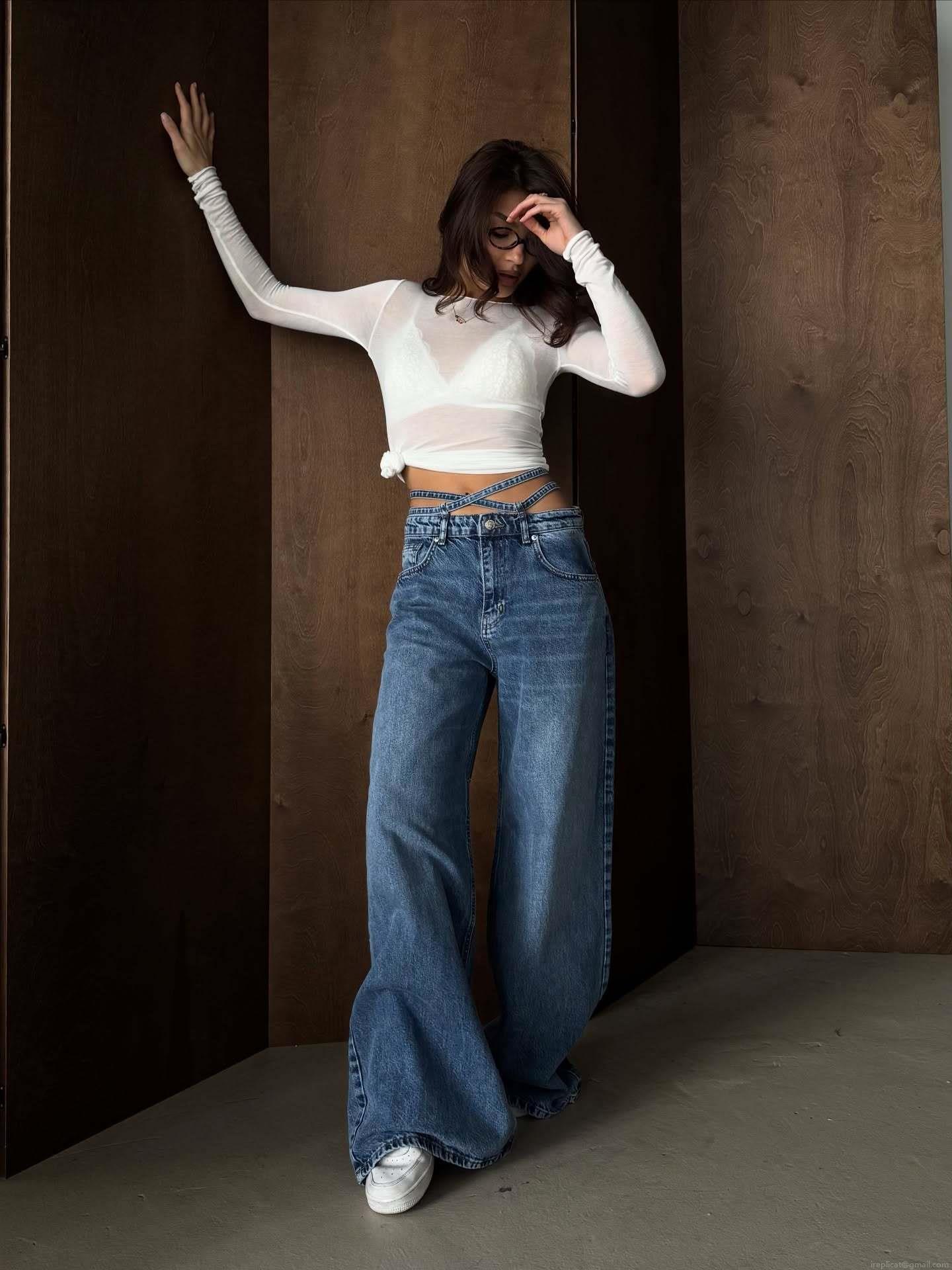• Women's American Vintage High Waist Criss Cross Wide Leg Jeans 100% Cotton Loose Straight Denim Trousers Streetwear Casual Blue Long Pants