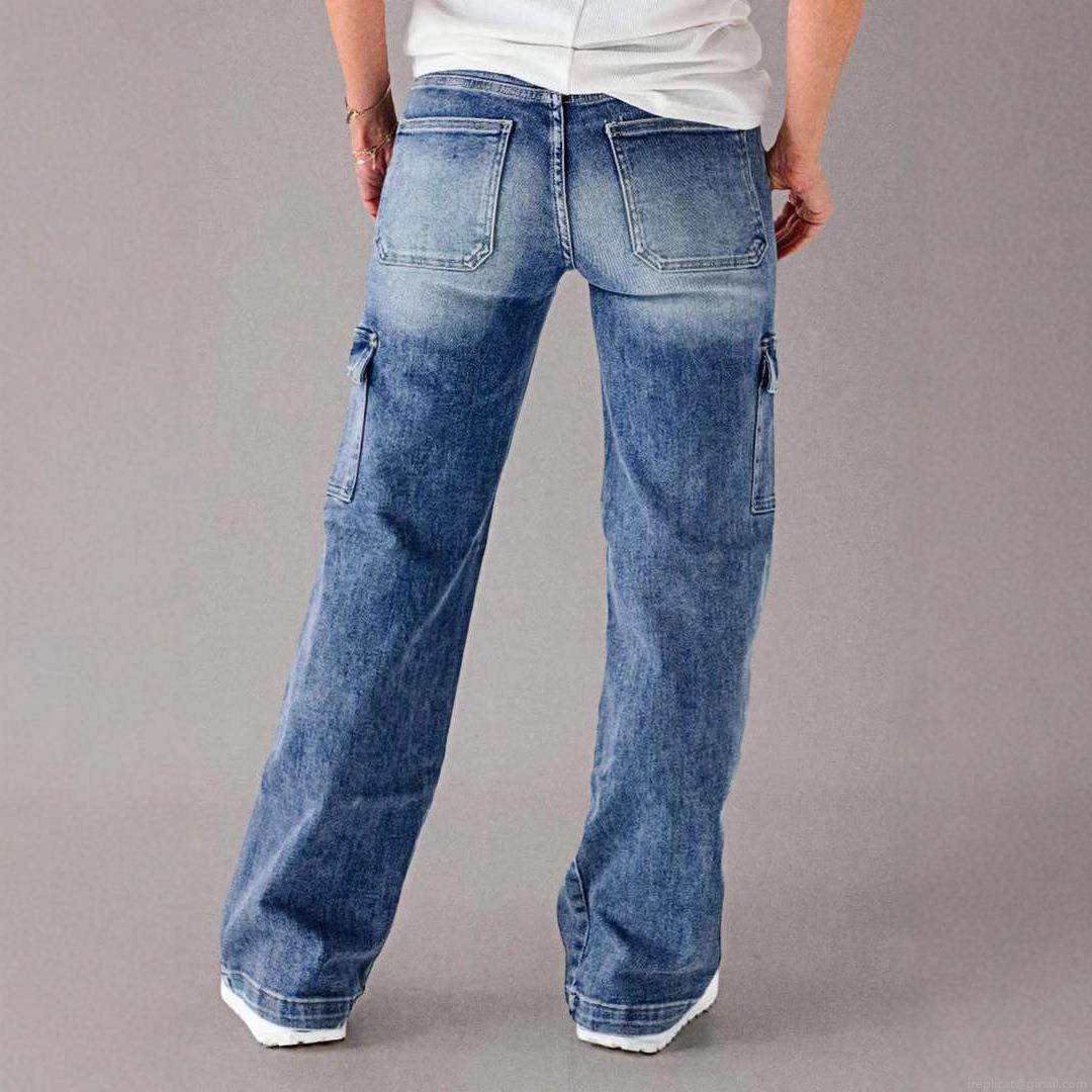 • Women's Cargo Denim Jeans Loose Straight Leg Washed Blue Pants With Drawstring Waist Casual Streetwear Cotton Blend Multi Pocket Trousers For Women