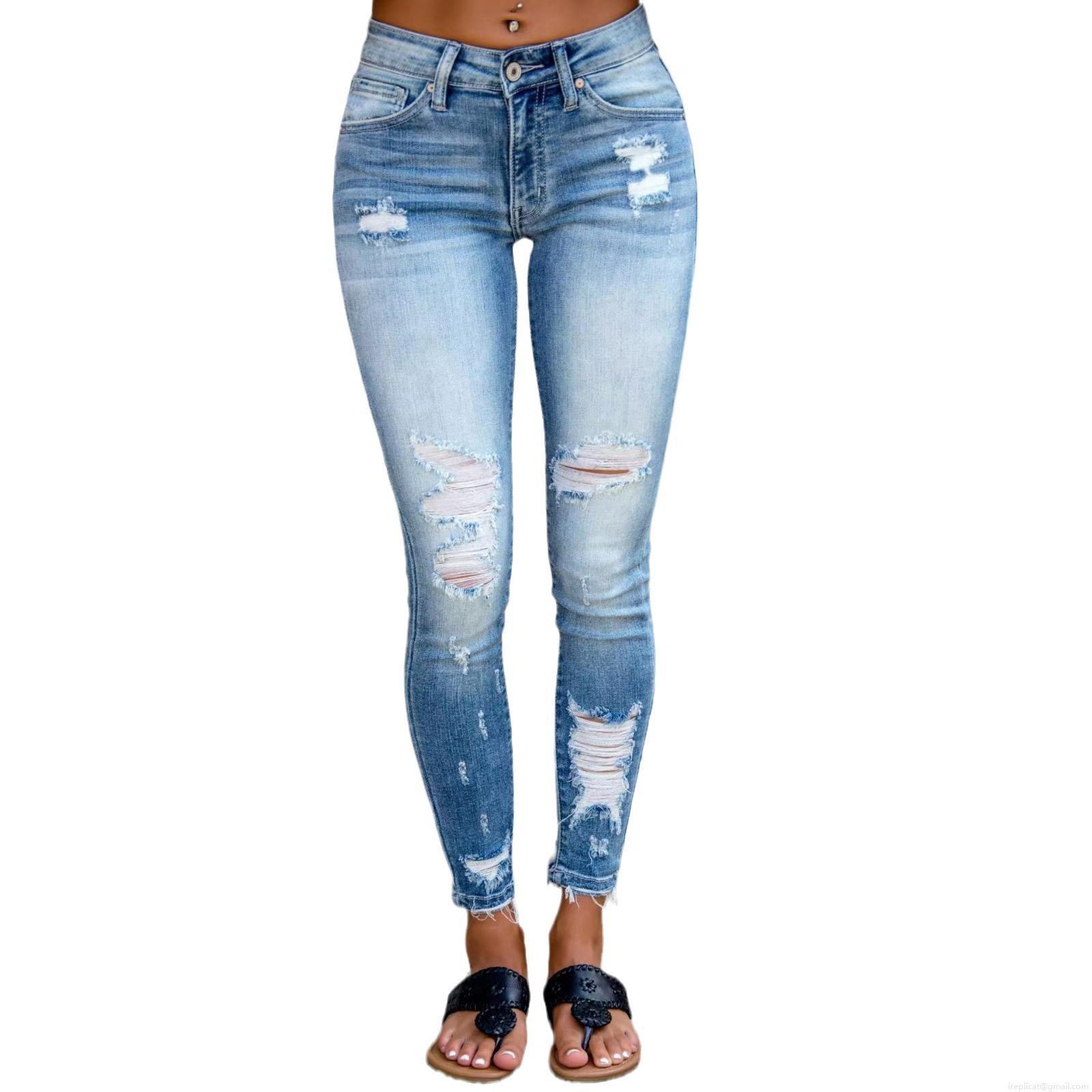 Women's Distressed Skinny Jeans Cotton Blend Denim Torn Mid Waist Long Trousers Streetwear Casual Pants For Women