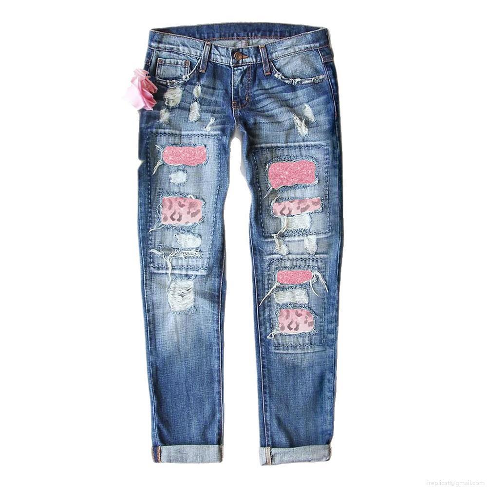 Women's Distressed Straight Leg Jeans Cotton Blend Mid Waist Denim Pants With Leopard Print And Pink Glitter Patchwork For Casual Streetwear Daily Wear