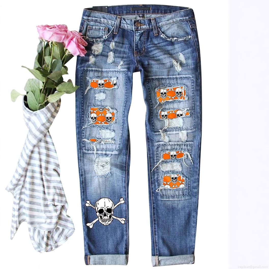Women's Distressed Straight Leg Jeans Skull Head Print Denim Pants Loose Fit Ripped Patchwork Streetwear Cotton Blend Denim Trousers