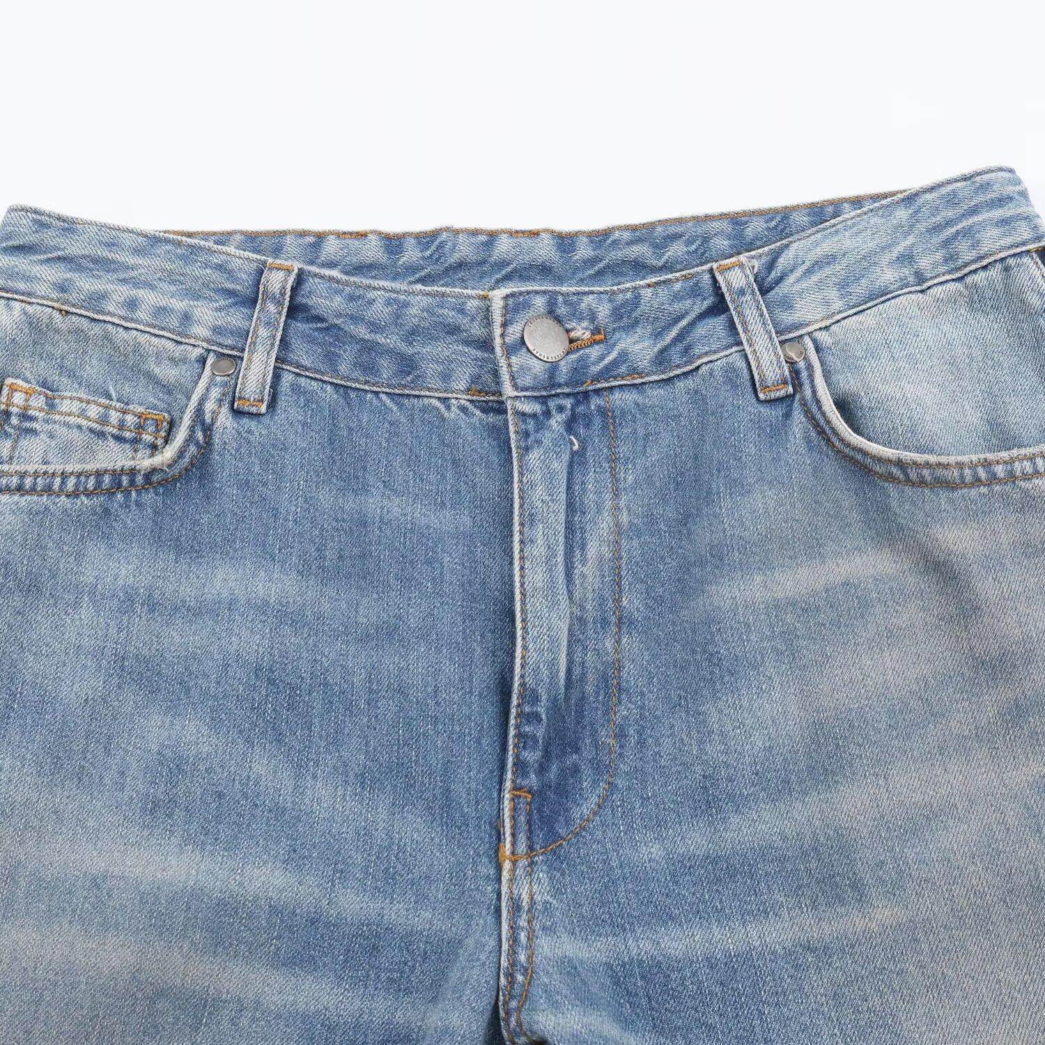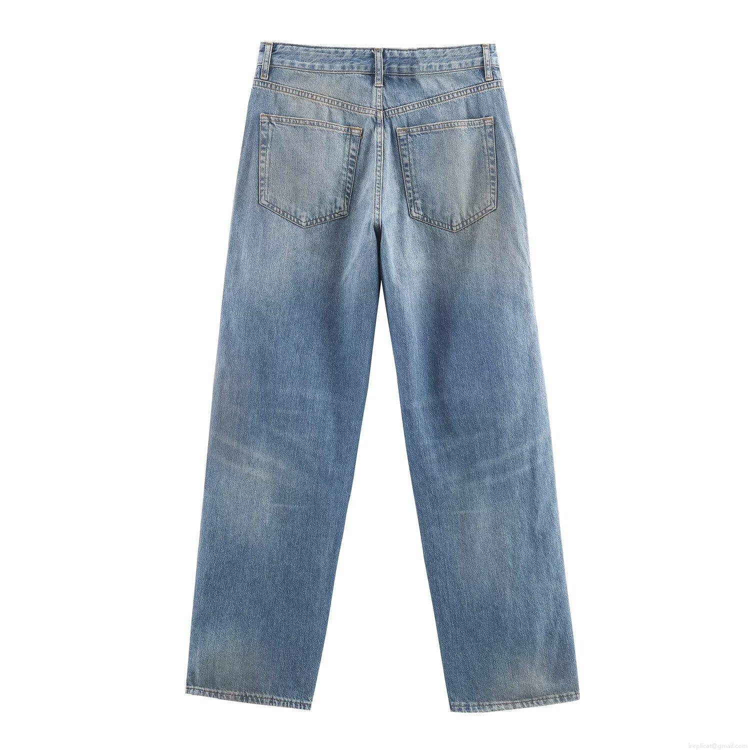Women's Fashion Mid Waist Straight Leg Denim Jeans With Side Zipper Washed Vintage Blue Polyester Spandex Long Pants For Women Casual