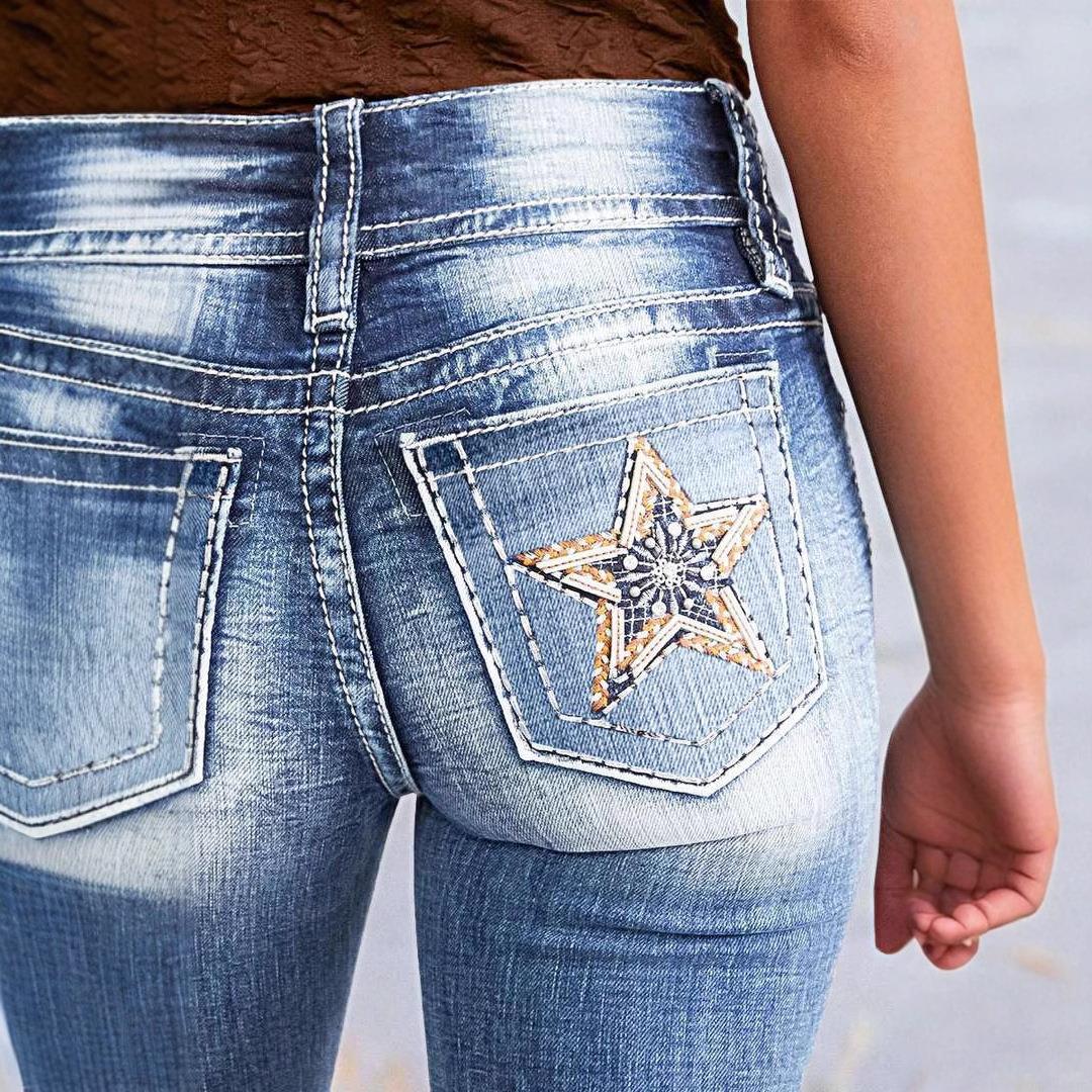 • Women's High Stretch Bootcut Denim Jeans With Star Embroidery Cotton Blend Distressed Washed Blue Slim Fit Straight Leg Long Pants For Women Streetwear Sexy Trousers
