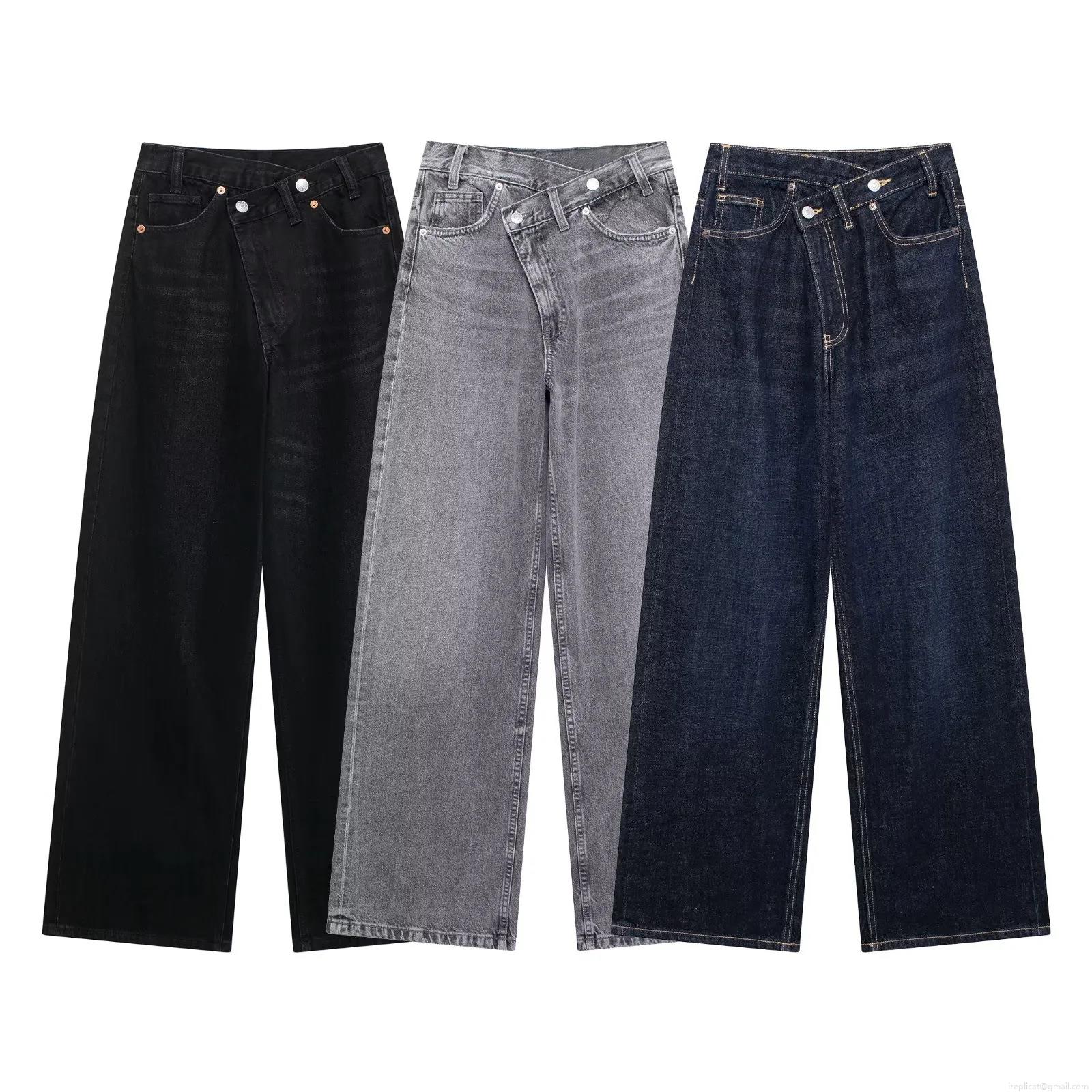 Women's High Waist Asymmetric Criss-Cross Button Denim Jeans Wide Leg Loose Straight Washed Casual Cotton Blend Long Pants Fashion Streetwear Lady