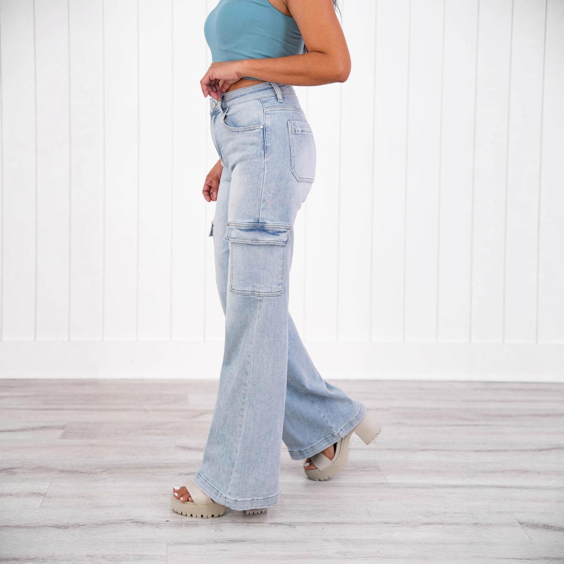 • Women's High Waist Cargo Jeans Light Blue Wide Leg Straight Denim Pants With Multi Pockets Casual Streetwear Fashion Long Trousers