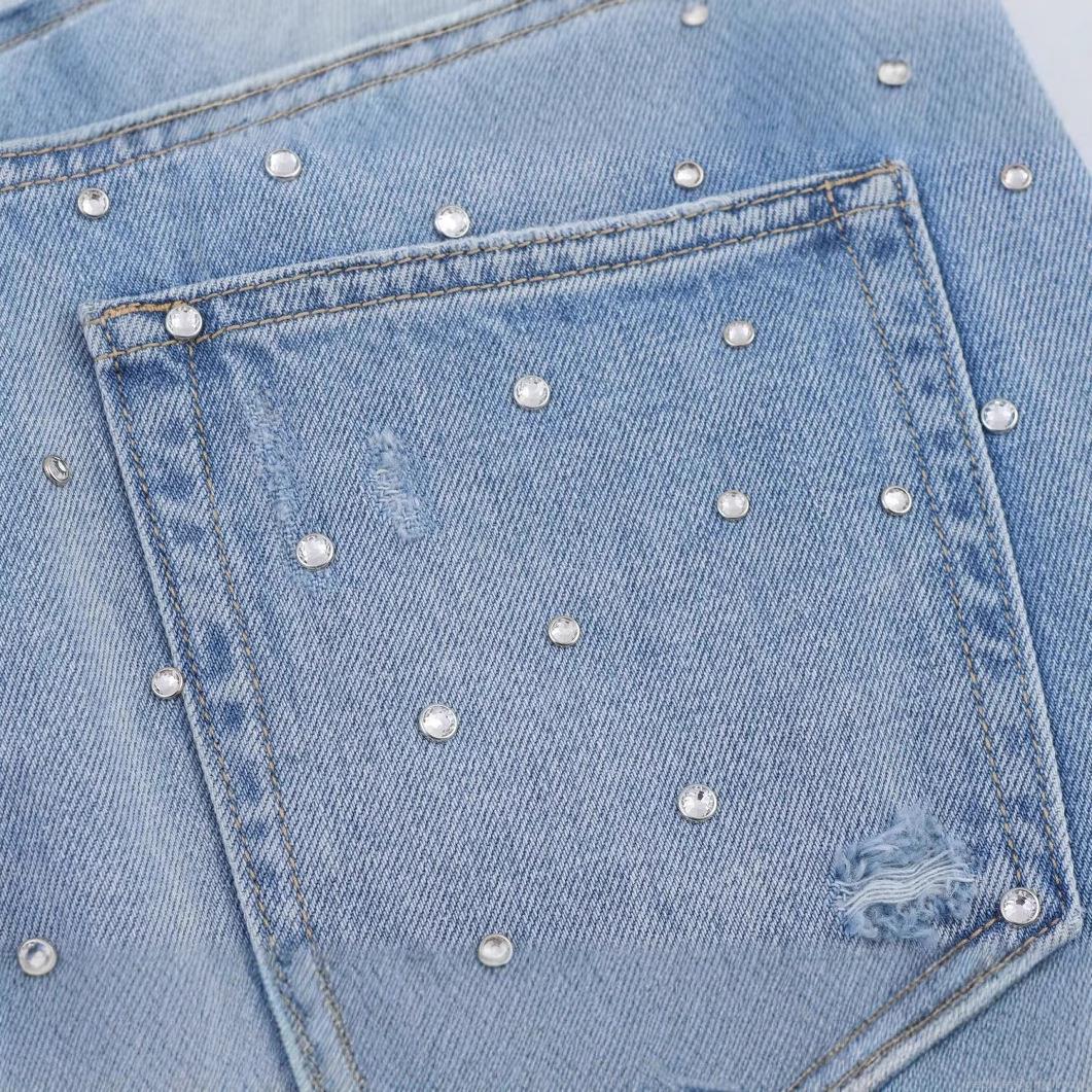• Women's High Waist Rhinestone Studded Straight Leg Jeans Distressed Light Blue Denim Pants Casual Loose Streetwear Trousers