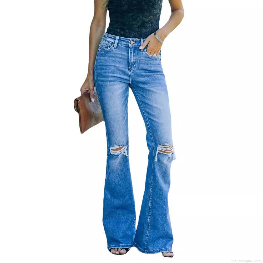 Women's High Waist Ripped Flare Jeans Distressed Washed Denim Bell Bottom Pants Casual Stretchy Slim Fit Long Denim Trousers Streetwear for Women