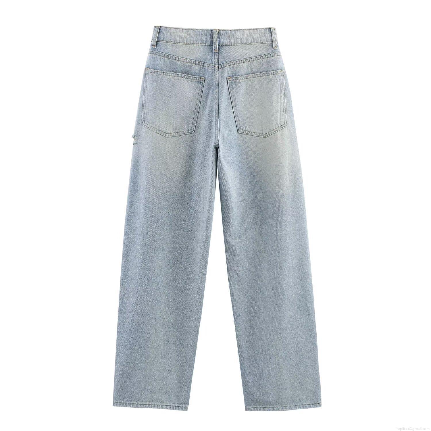 • Women's High Waist Ripped Wide Leg Jeans Fashion Light Blue Distressed Straight Denim Pants Summer Casual Streetwear For Ladies