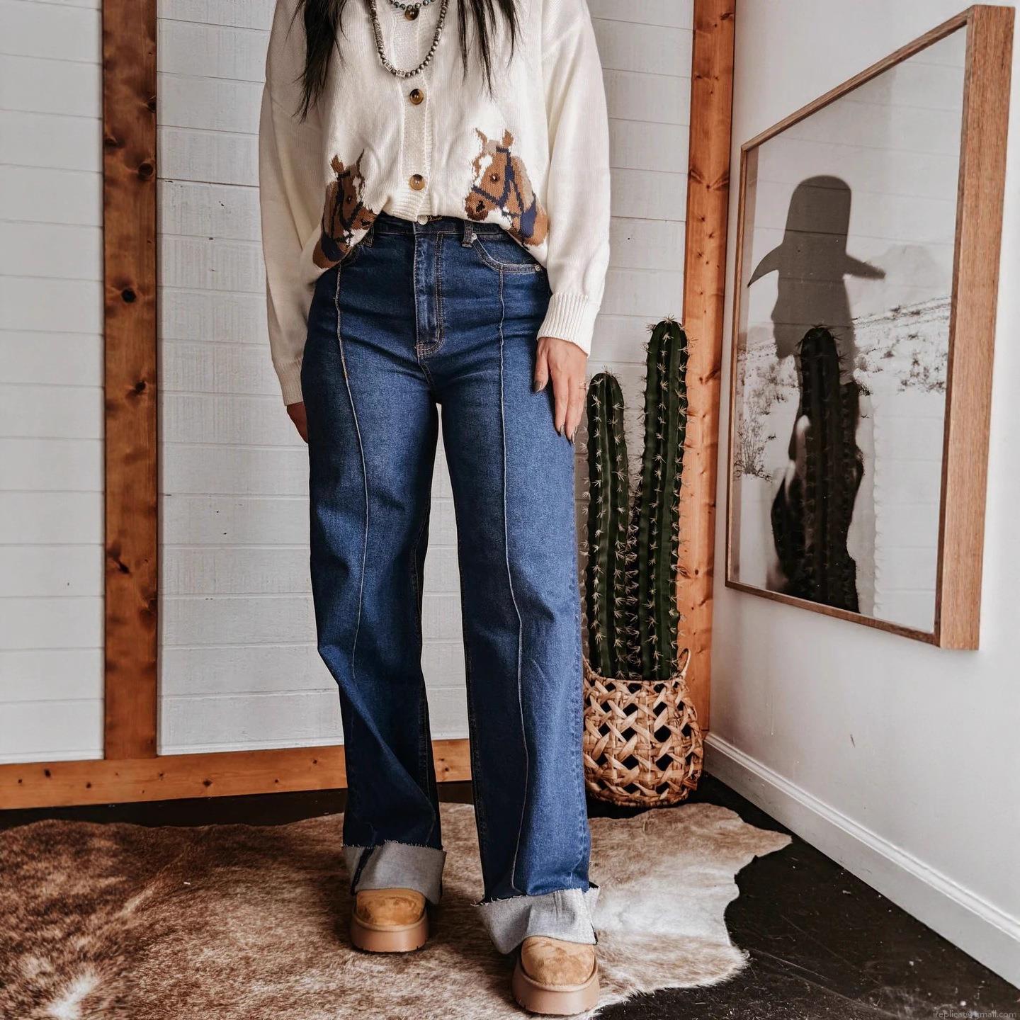 Stylish retro high-waisted wide leg jeans! Perfect washed finish, clean center seam design, cute cuffed hem and comfy straight fit. Great for casual streetwear, durable denim, flattering and high quality!