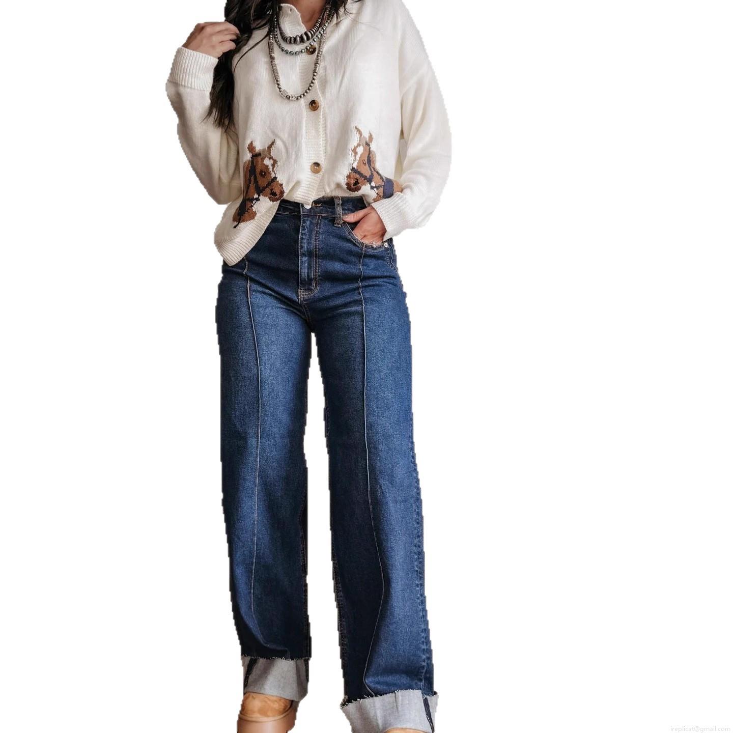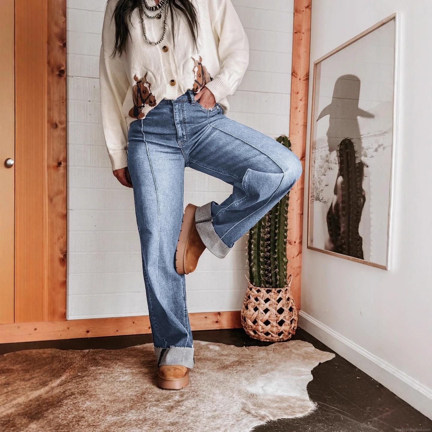 • Women's High Waist Wide Leg Jeans Retro Washed Center Seam Denim Pants With Cuffed Hem Casual Streetwear Straight Leg Trousers For Women