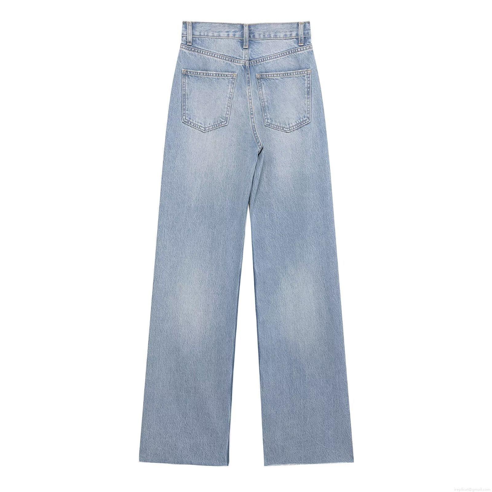 • Women's High Waist Wide Leg Jeans Washed Denim Fabric Straight Long Pants With Raw Hem Casual Daily Wear 5-Pocket Loose Trousers For Lady