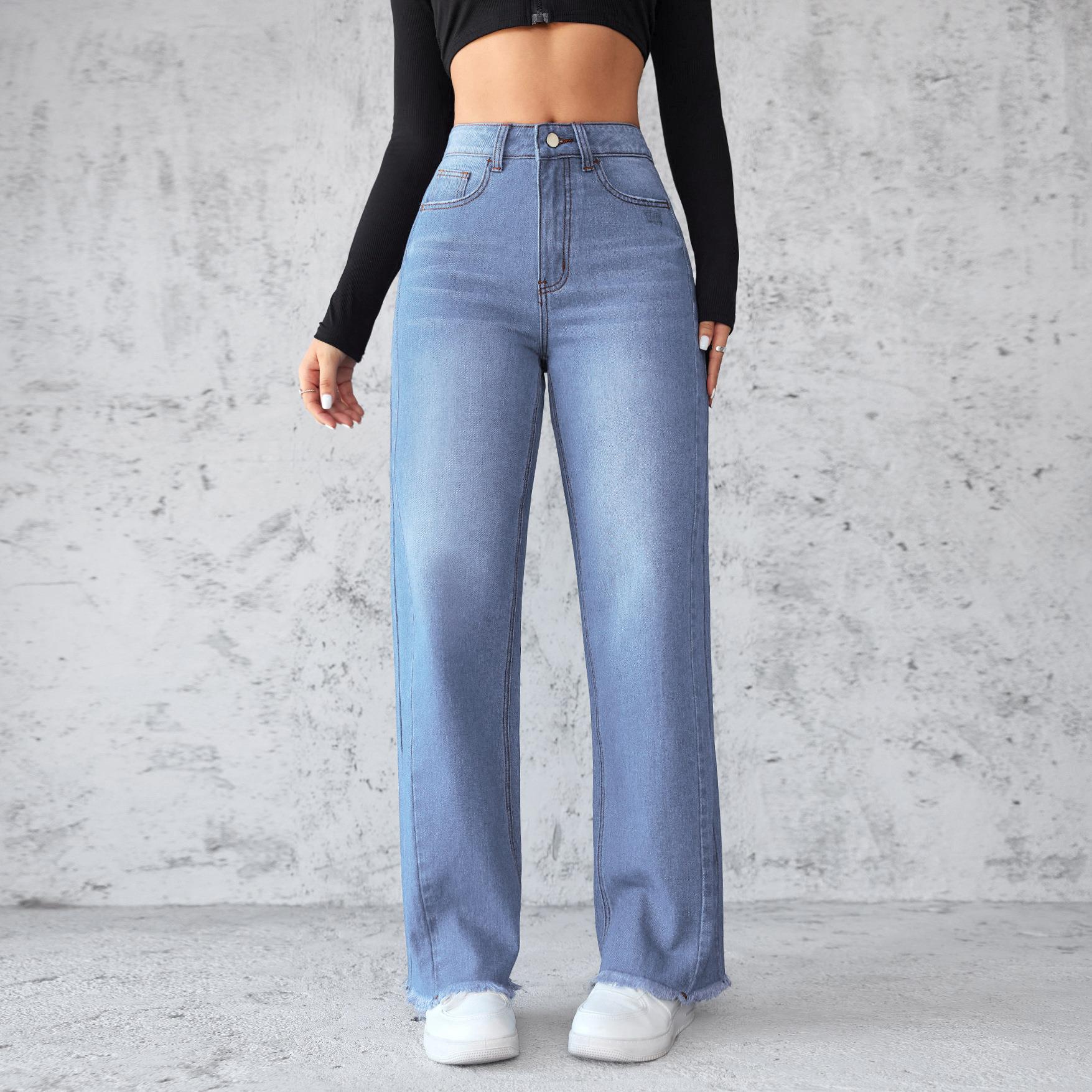 • Women's High Waist Wide Leg Jeans Washed Denim Pants With Frayed Hem Streetwear Straight Leg Trousers For Women Cotton Blend Denim Clothing