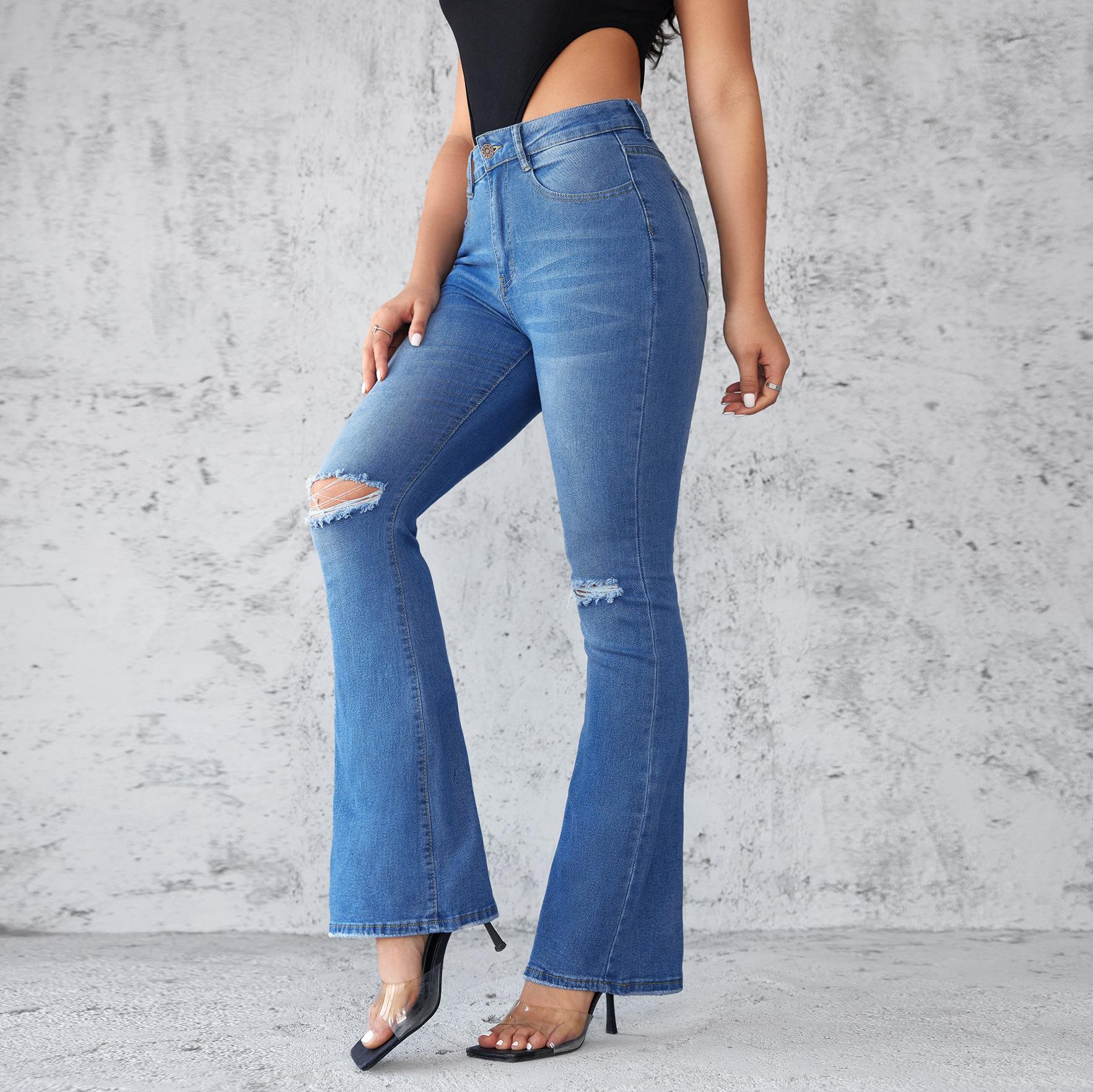 Women's High Waisted Flare Jeans Stretch Distressed Ripped Knee Denim Pants Slim Fit Retro Streetwear Long Trousers For Women Daily Wear