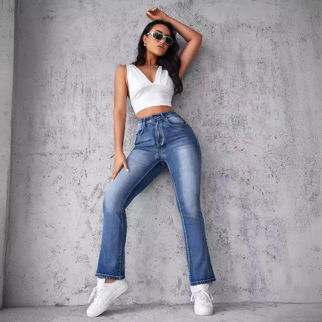Women's High Waisted Flared Jeans Fashion Distressed Blue Patchwork Denim Trousers Streetwear Casual Slim Fit Long Pants For Women