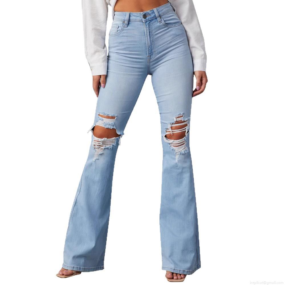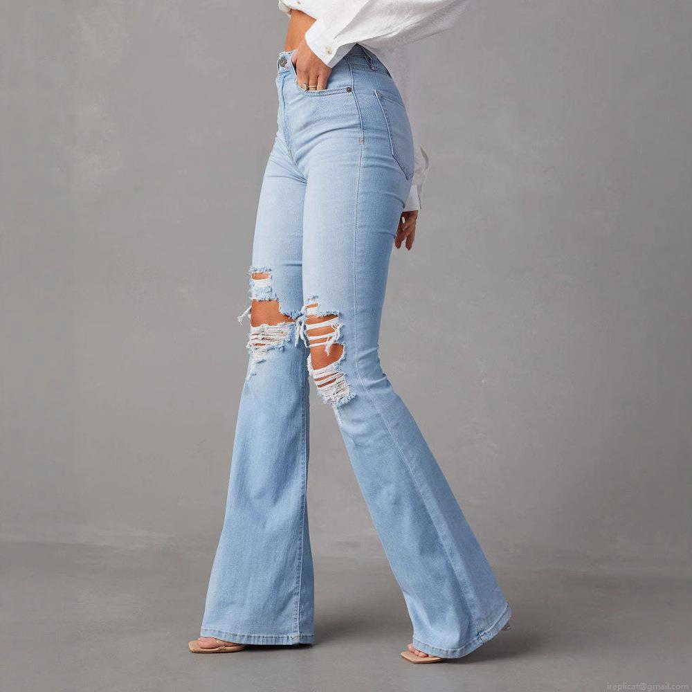 • Women's High Waisted Ripped Flare Jeans Distressed Denim Bell Bottom Trousers Streetwear Style Light Blue Long Pants for Ladies