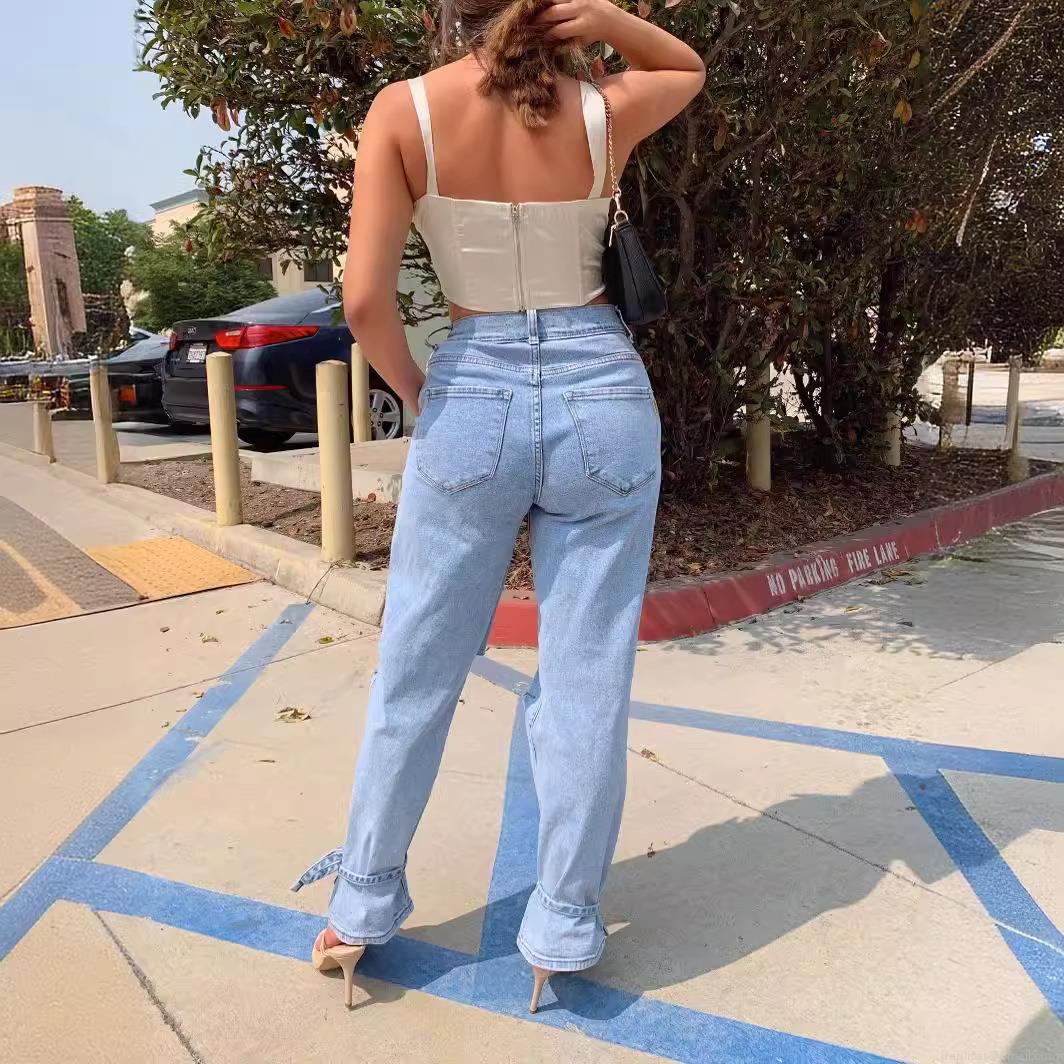 • Women's High Waisted Ripped Straight Jeans Cotton Polyester Blend Denim Destructed Knee Hole Lace-up Split Hem Casual Commute Streetwear Long Denim Trousers