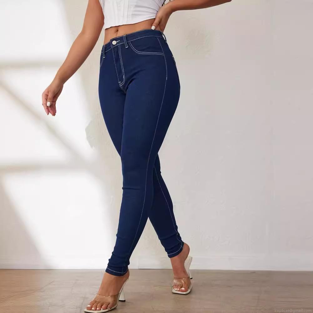 Women's High Waisted Skinny Jeans Deep Blue Denim Pants Contrast White Stitching Vintage Slim Fit Stretch Pencil Trousers Casual Streetwear Bottoms