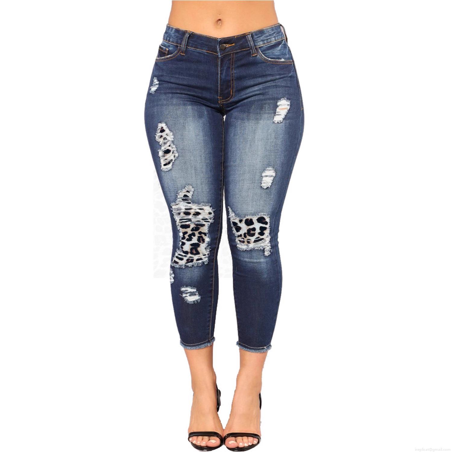 • Women's High Waisted Skinny Ripped Jeans Cotton Blend Distressed Denim Cropped Pants With Leopard Print Patchwork Streetwear Slim Fit Jeggings