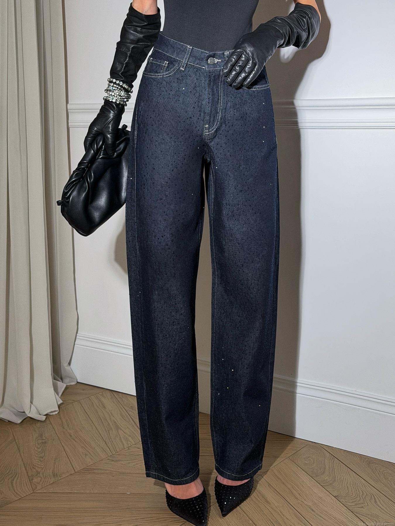 • Women's High Waisted Straight Leg Rhinestone Jeans 100% Cotton Denim Pants Loose Fit Wide Leg Trousers Sparkling Streetwear Fashion Fall Winter Dark Blue
