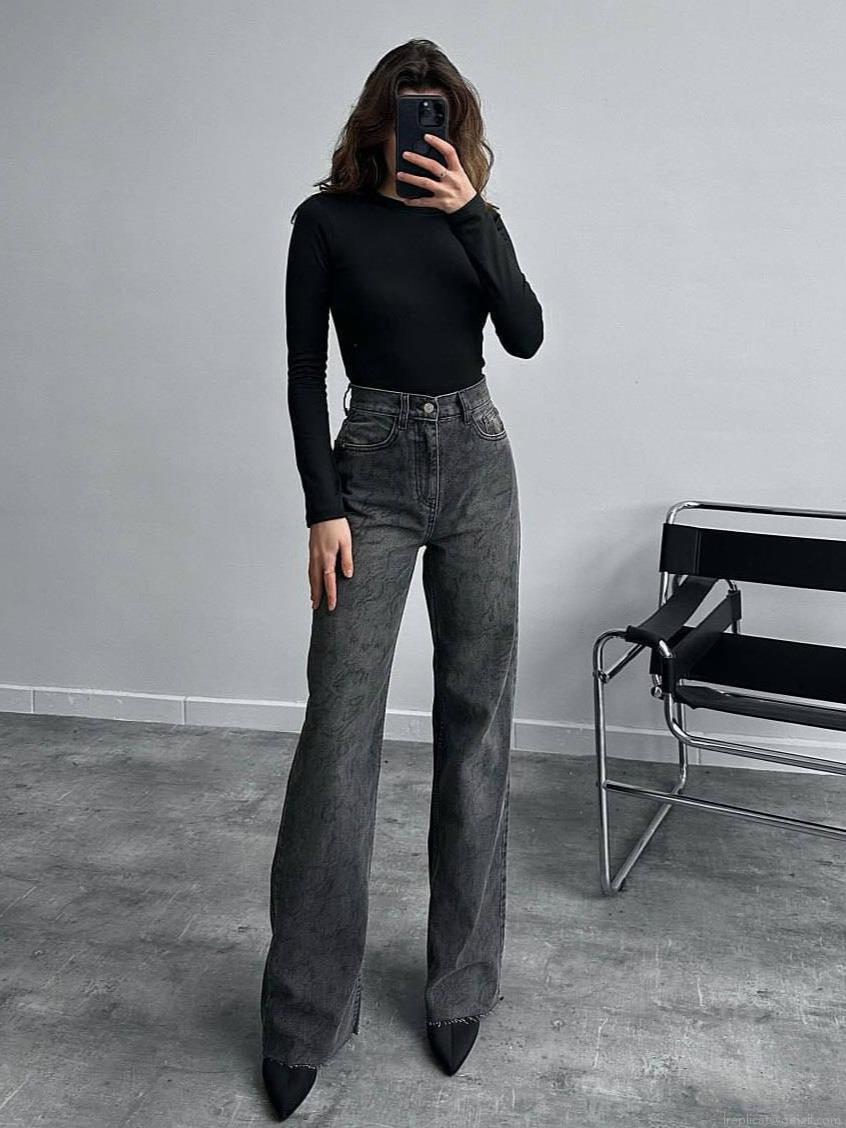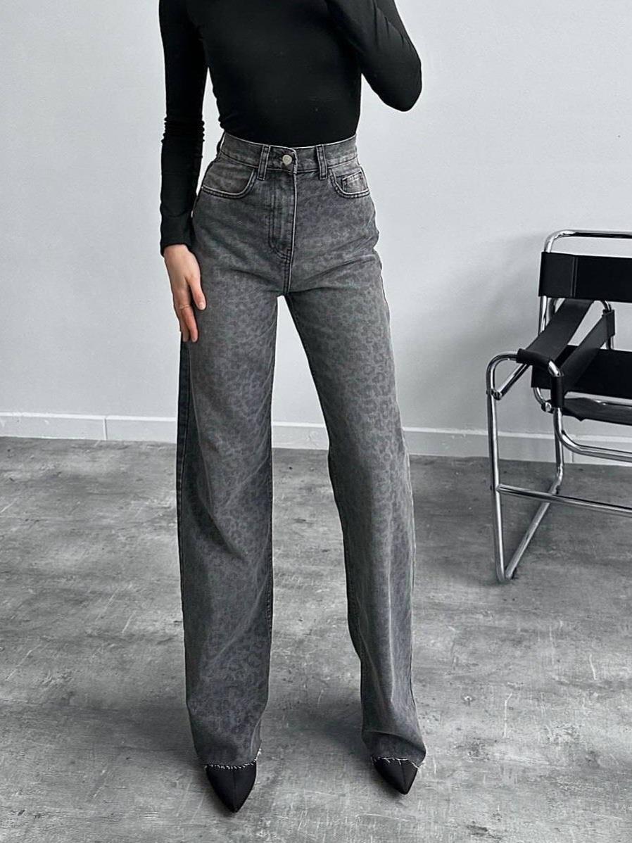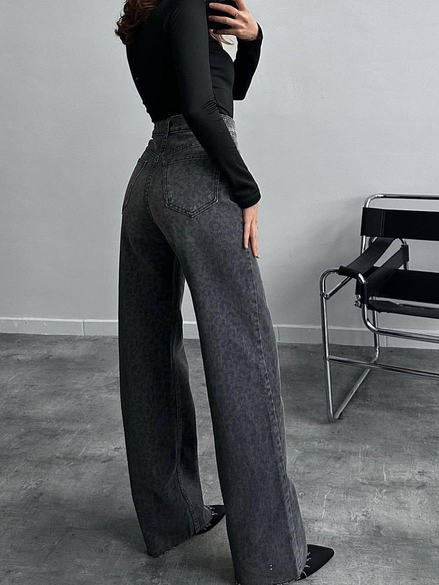 • Women's High Waisted Wide Leg Jeans Leopard Print Cotton Blend Straight Denim Pants Streetwear Casual Loose Long Trousers Fashionable Black Gray