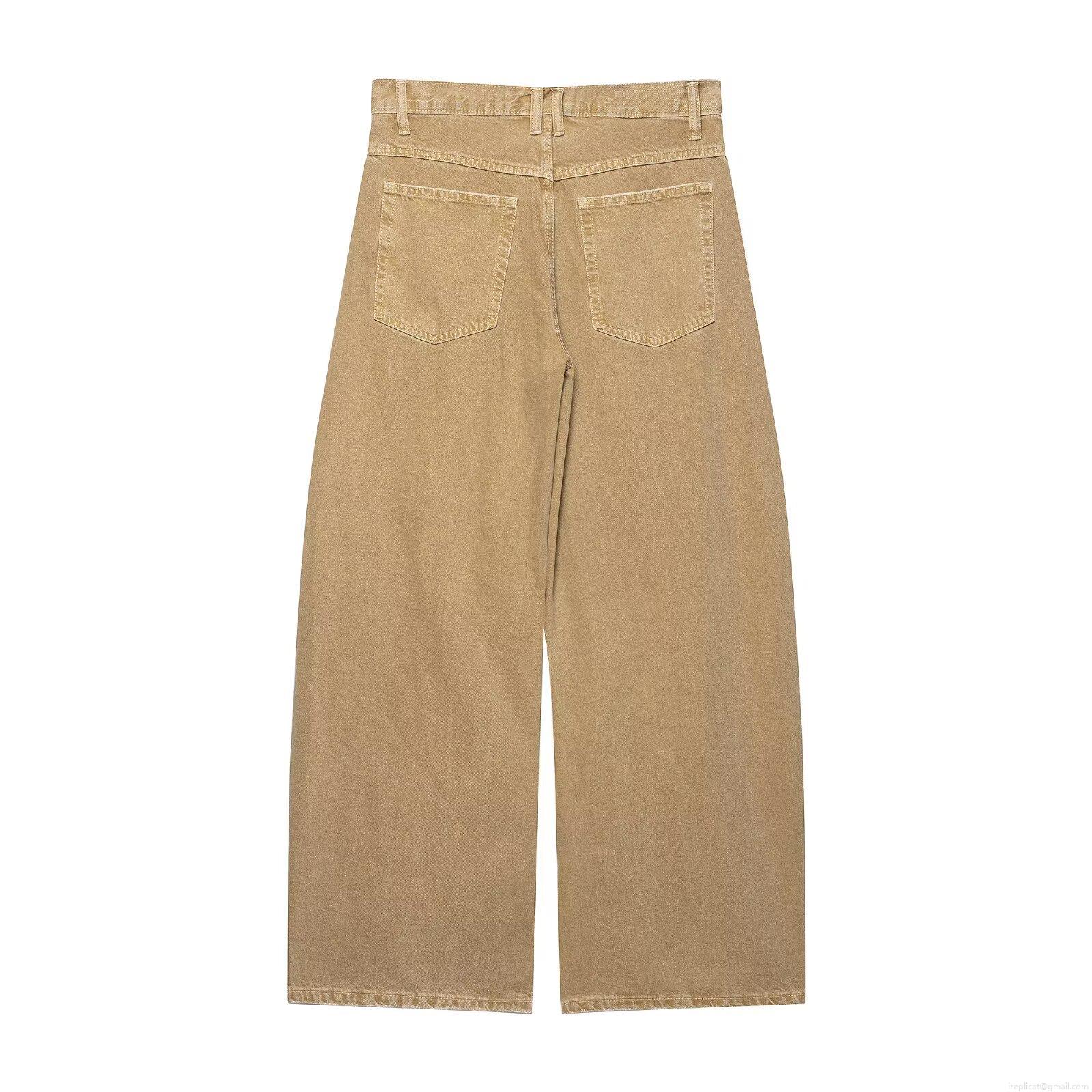 Women's Khaki Denim Cotton Wide Leg Jeans Loose Low Waist Straight Cut Pants Casual Bohemian Style Washed Denim Trousers For Ladies