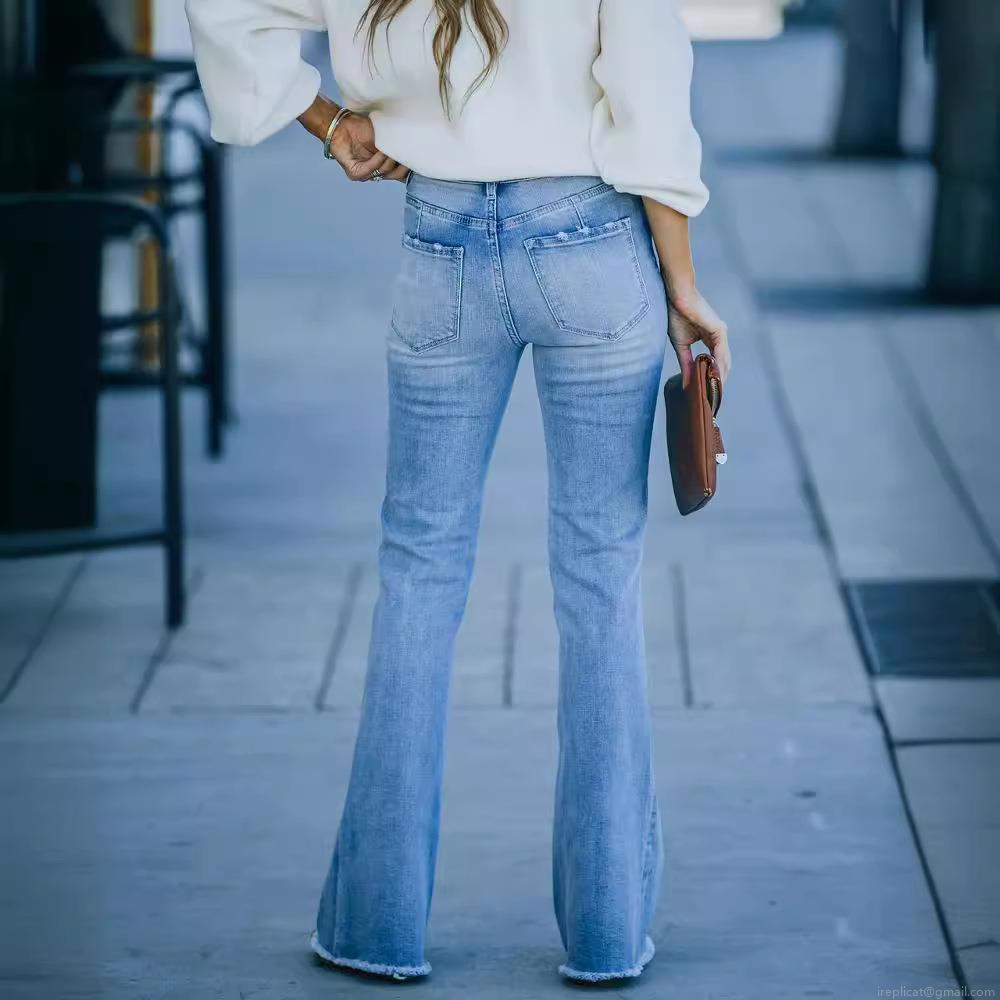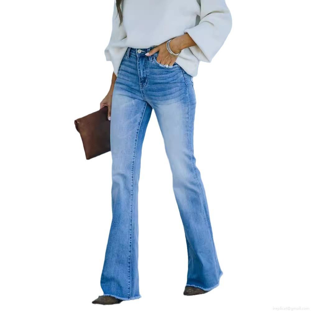 • Women's Light Blue High Waisted Flared Jeans Cotton Blend Washed Denim Pants With Raw Hem For Commuter Casual Street Style