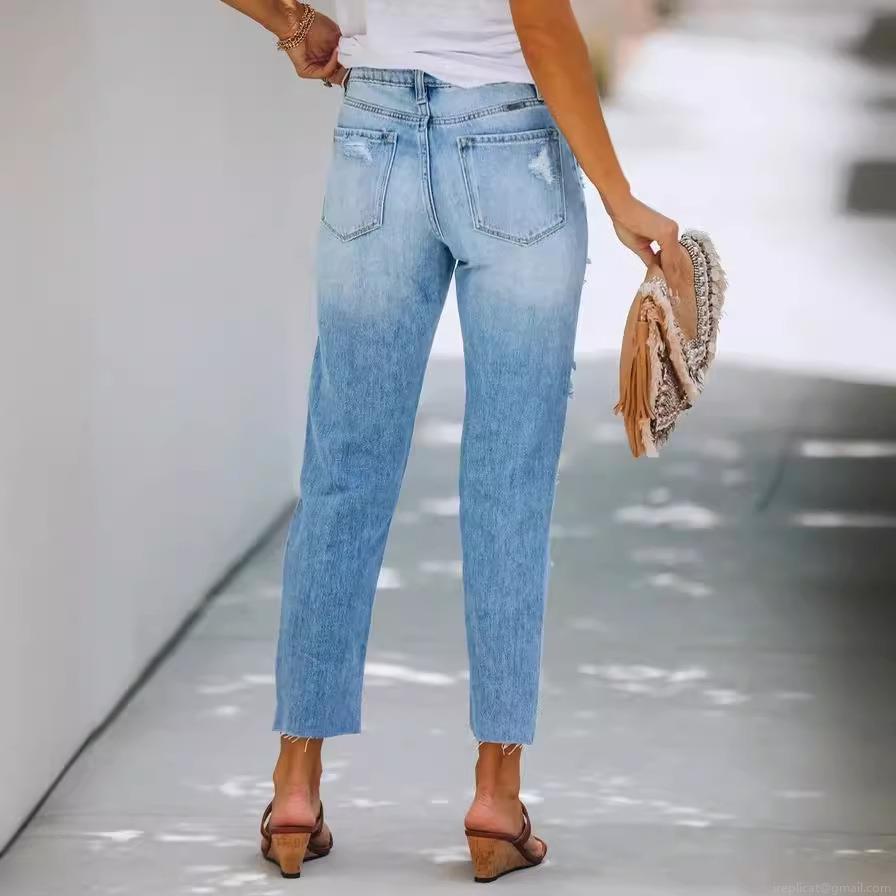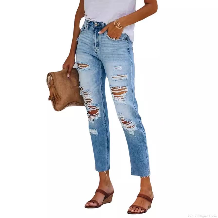 • Women's Ripped Denim Jeans Slim Fit Light Blue Washed Distressed Stretchy Long Pants With Raw Hem For Streetwear Fashion Casual Trousers