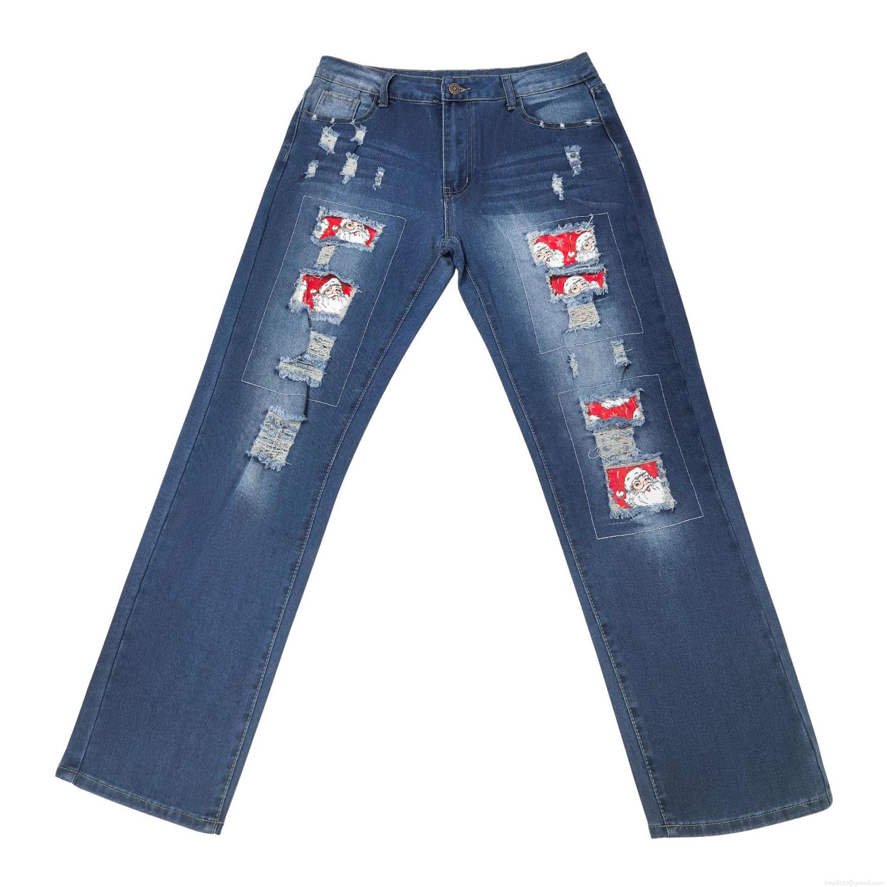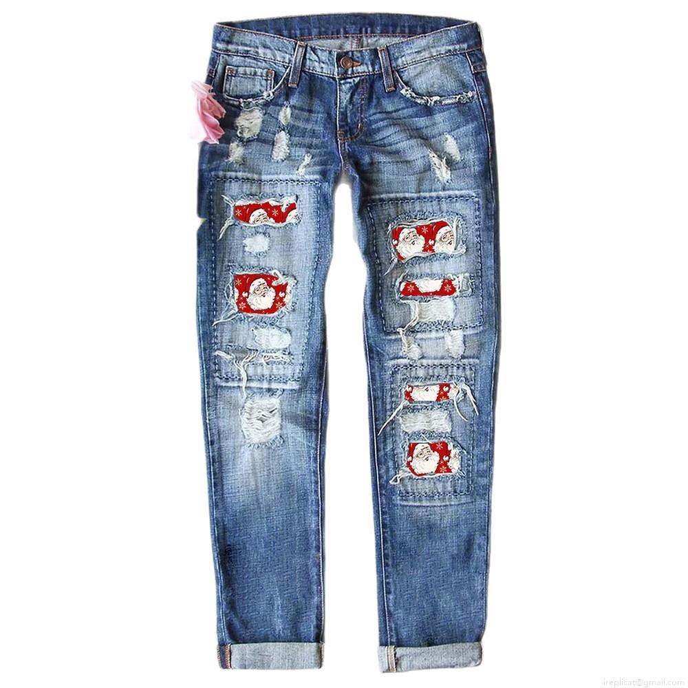 • Women's Ripped Straight Leg Jeans Washed Denim Cotton Pants With Santa Claus Patch Distressed Christmas Holiday Party Trousers For Women