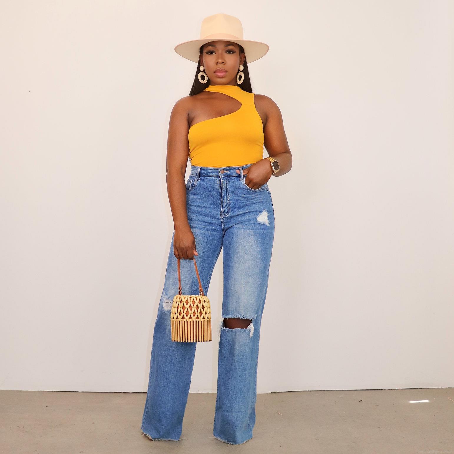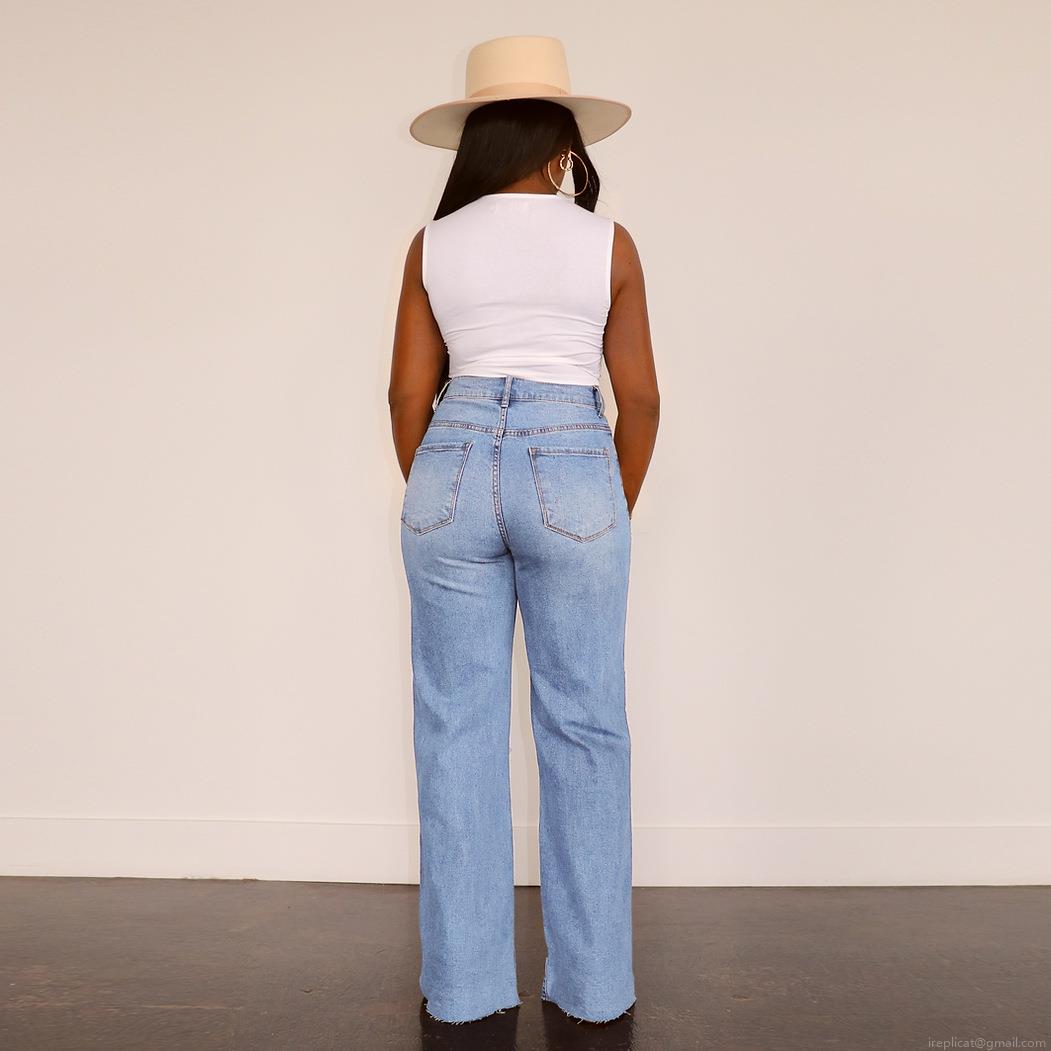• Women's Ripped Wide Leg Jeans Cotton Blend Distressed Denim High Waist Straight Long Pants Streetwear Casual Washed Trousers With Raw Hem