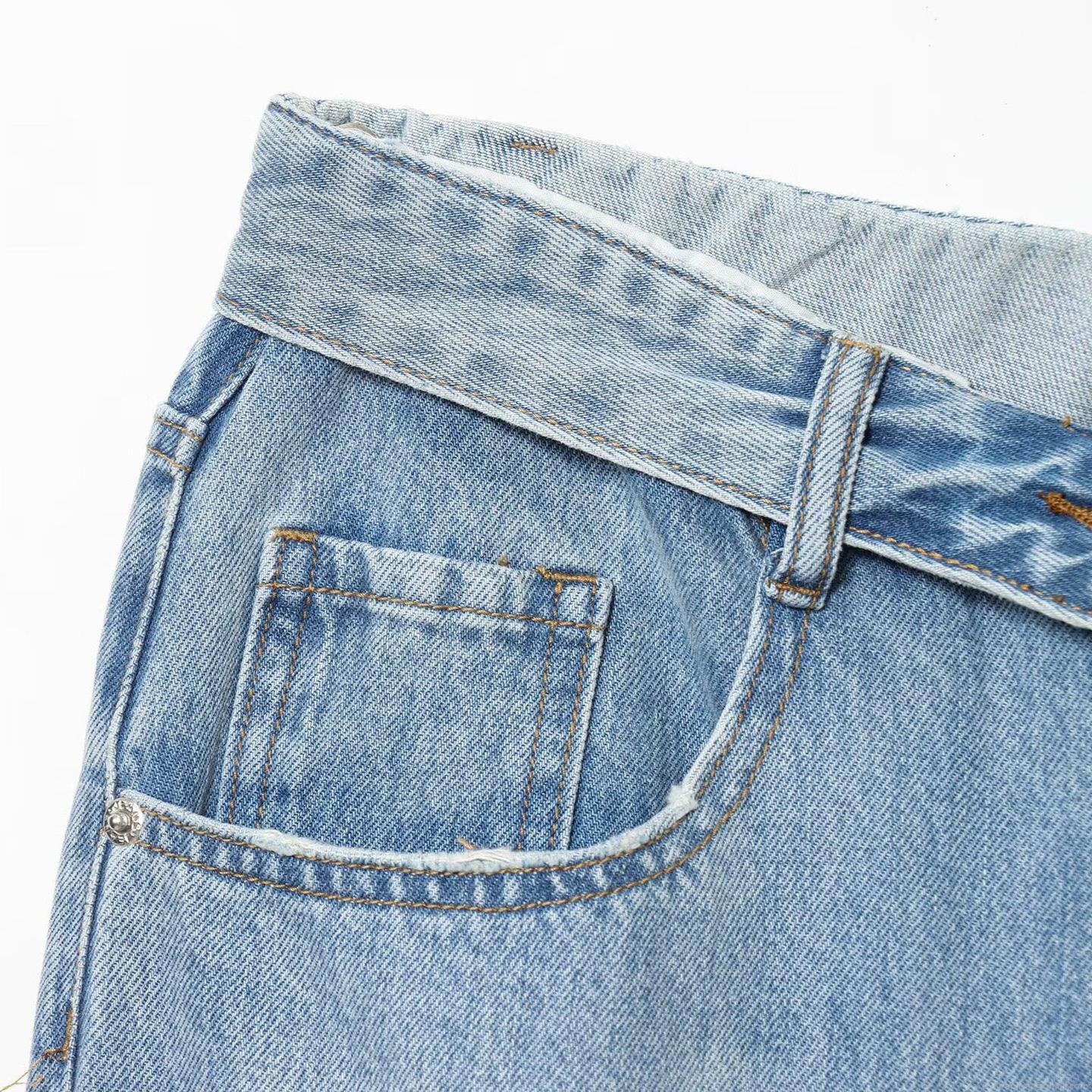 Women's Sexy Fold-Over Waist Distressed Denim Jeans Casual Wide Leg Straight Trousers Light Blue Washed Cotton Denim Pants For Fashion Lady