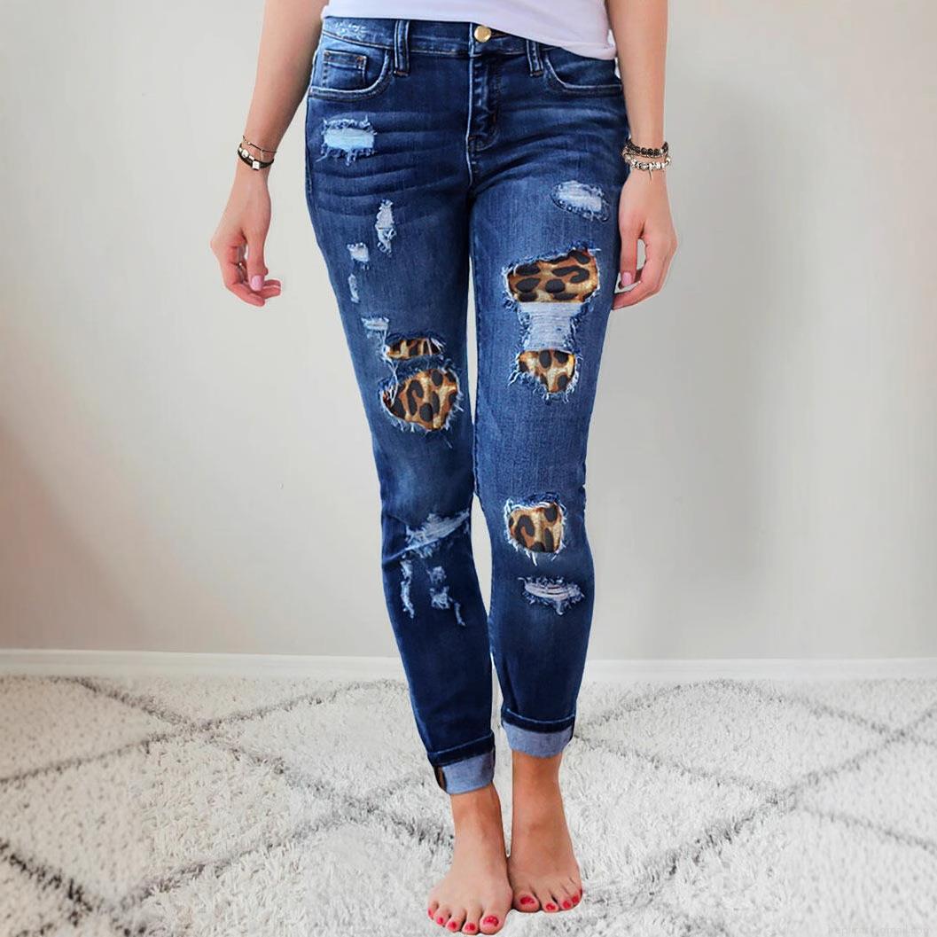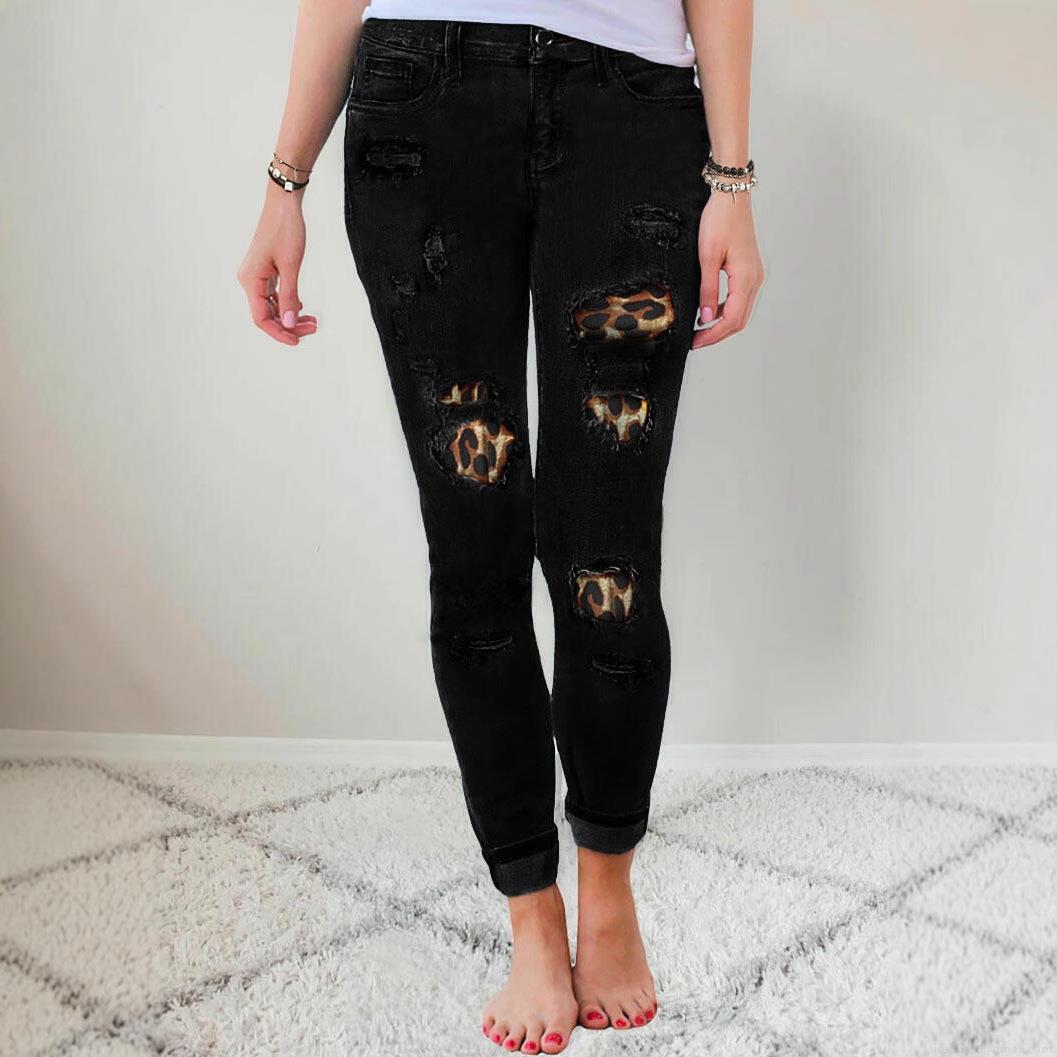 Women's Skinny Ripped Denim Jeans With Leopard Print Patch High Waist High Stretch Distressed Pencil Long Pants For Casual Streetwear Outfits